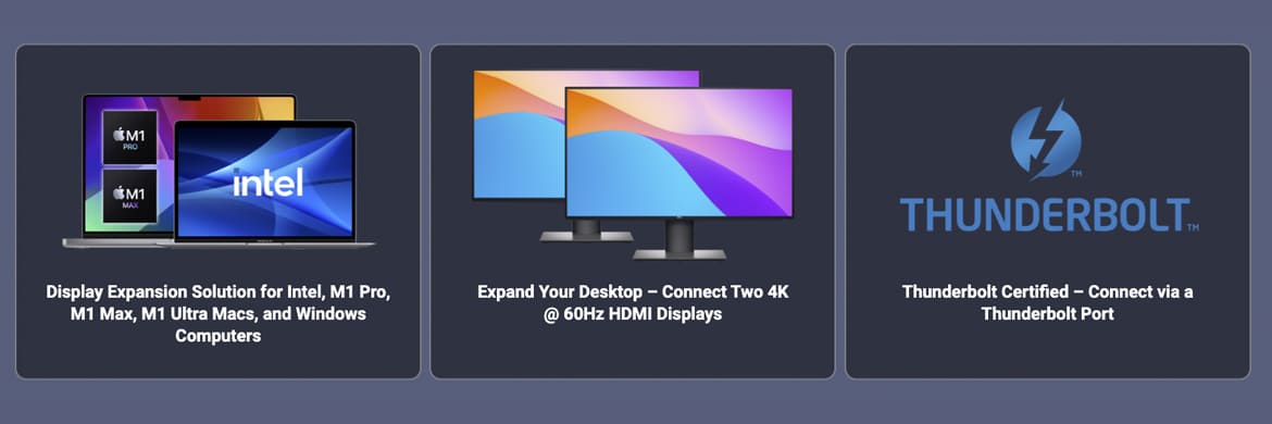 Compatible with Intel and Apple M1 Pro, M1 Max, M1 Ultra Macs and Windows 11 or 10 Thunderbolt ComputersSonnet's Thunderbolt Dual HDMI Adapter is ideal for many computers with Thunderbolt ports. Thunderbolt's 40Gbps interface lets you run Ultra HD 4K resolution at 60Hz on both displays at full performance. Need two 4K monitor support with your M1 Mac or PC without Thunderbolt? Check out Sonnet's DisplayLink Dual HDMI Adapter for M1 Macs.
