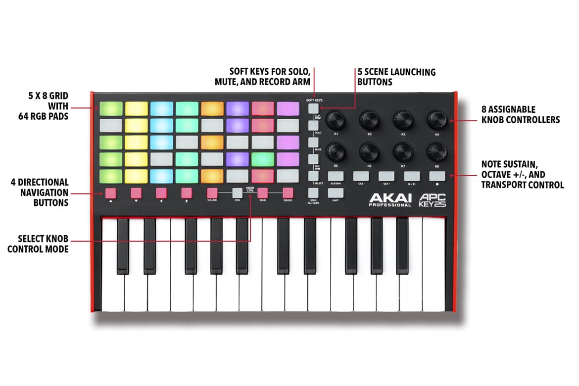 Enjoy serious hands-on control for a powerfully creative Ableton Live experience. APC Key 25 features 8 endless 360-knobs to adjust volume, pan, insert effect sends and more for smooth, intuitive control of your sessions. Tweak reverbs, sweep filters, or write automation that will bring your music to life. Shape your sounds instantly using the assignable endless 360-knob controls.