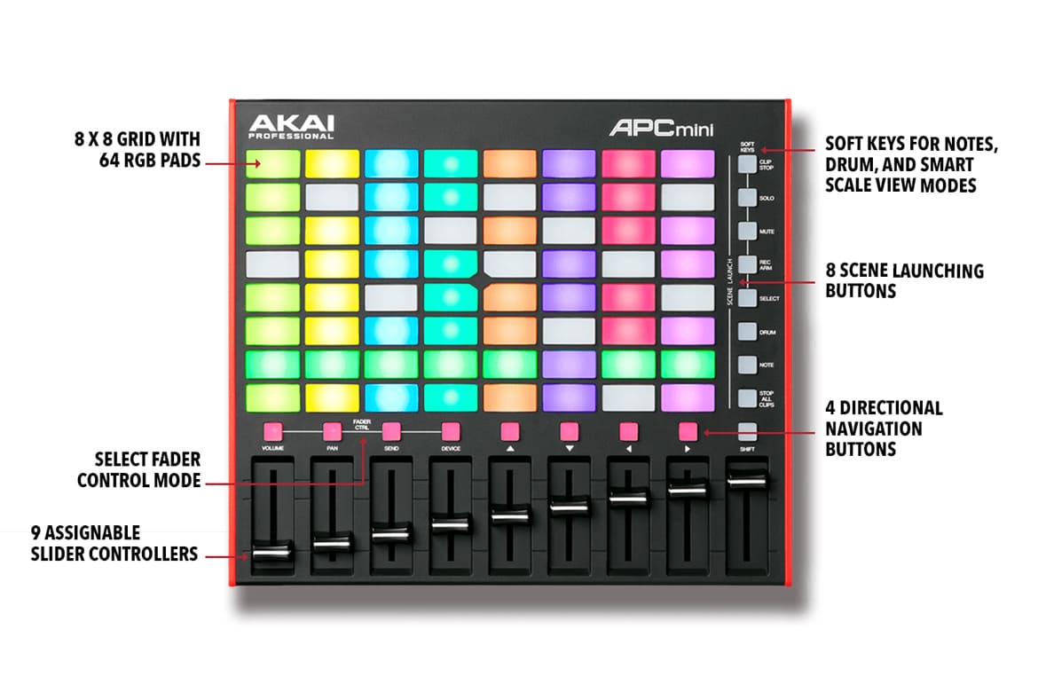 APC Mini includes Ableton Live Lite software. Start creating and making music with this powerful clip launching DAW packed with instruments, mixing effects, samples, and the ability to record and mix audio and MIDI. Ableton Live Lite offers all the tools to transform your musical ideas into exciting songs and performances.