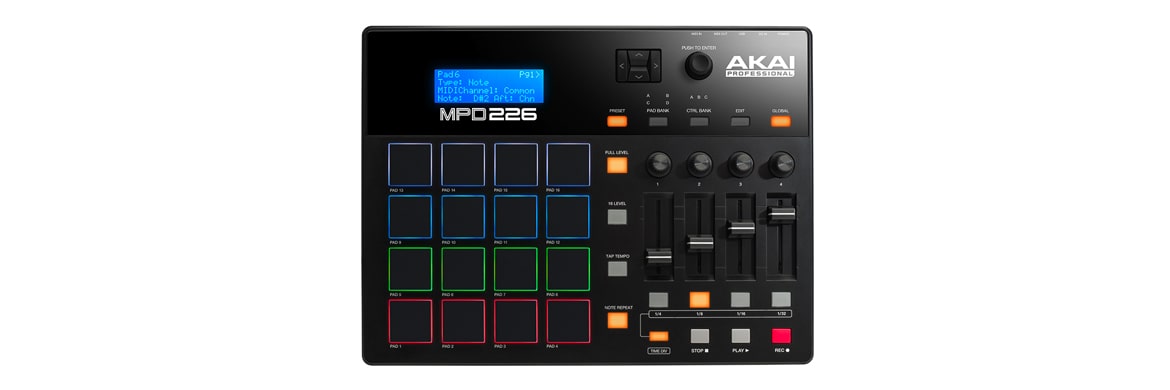 The MPD226 by AKAI Professional combines a pad controller with a control surface in a lightweight and compact package, offering producers, programmers, musicians and DJs the feel of classic MPC beat-making.