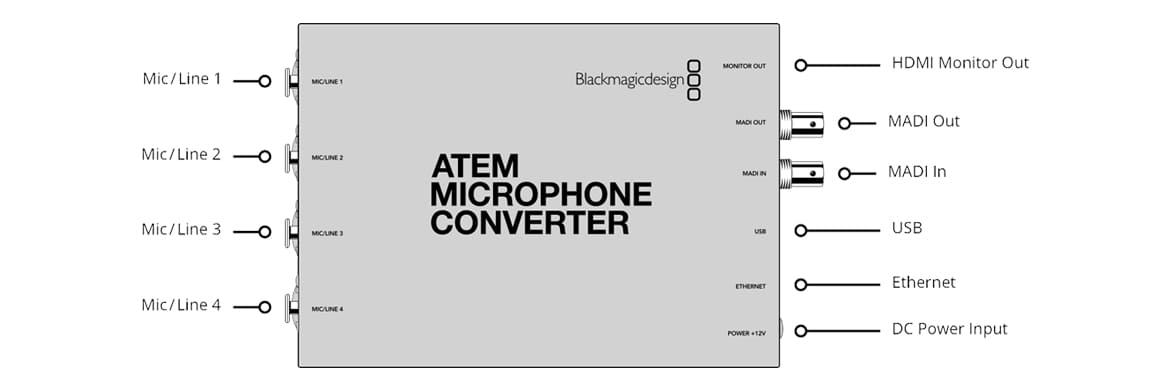 MADI, or Multichannel Audio Digital Interface, is a multi channel audio link standardized as AES10 by the Audio Engineering Society (AES) and it defines the data format for an interface for multiple channels of digital audio. The ATEM Microphone Converter’s MADI output embeds the 4 analog inputs as MADI channels 1, 2, 3 and 4. ATEM Microphone Converter also includes a MADI input, which is used to loop multiple converters when you need more than 4 channels of audio on a single MADI link. This means if a second converter is connected to the input of another, the upstream converter will stack its 4 channels above the 4 channels on the downstream converter.