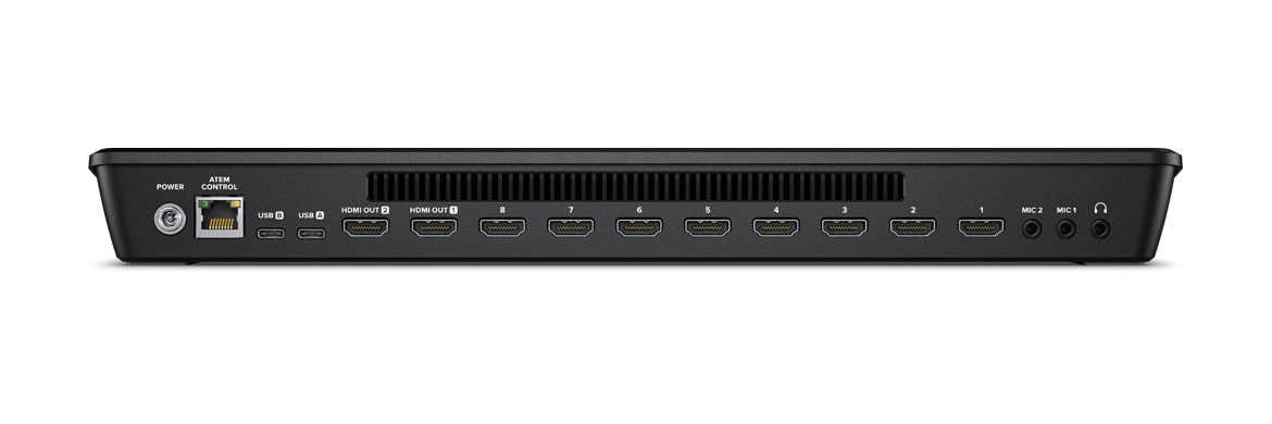 The front panel includes easy-to-use buttons for selecting sources, video effects, and transitions. The source buttons are large, allowing you to operate them by feel. Included on the ATEM Extreme are buttons for audio mixing, recording, and streaming control, as well as output selection buttons that let you change the video output between cameras, program, and multiview. On the rear panel, there are HDMI connections for cameras or computers, extra microphone inputs, USB for webcam out, plus an HDMI "AUX" output for program video.