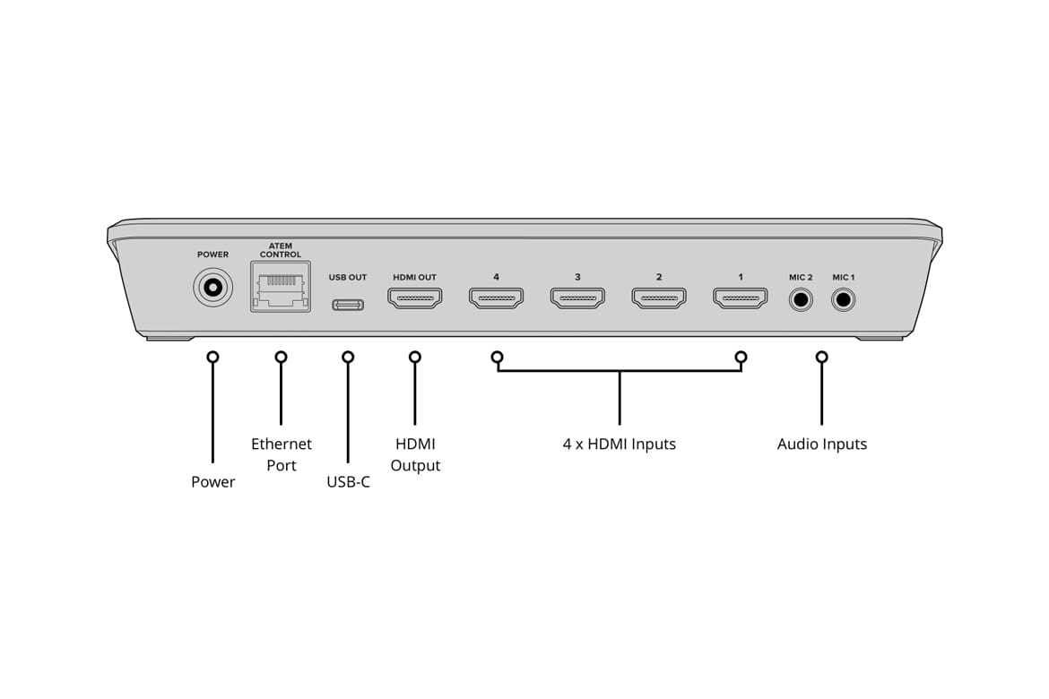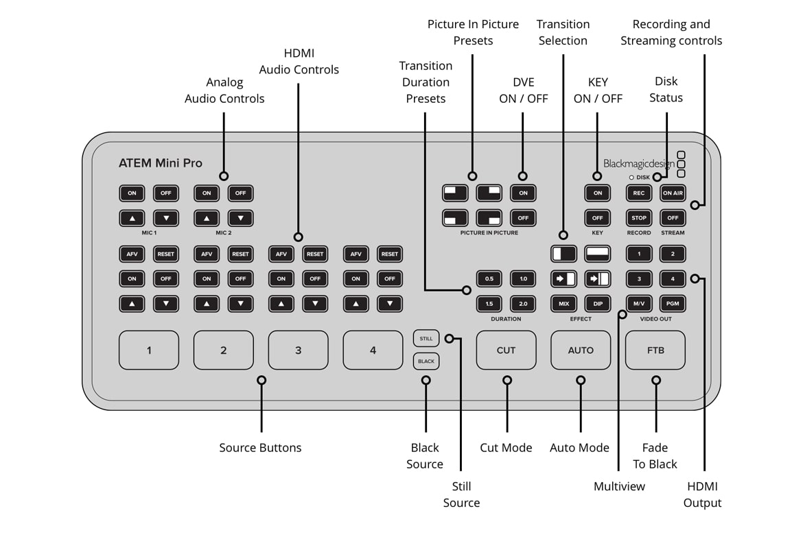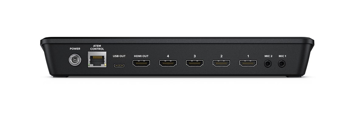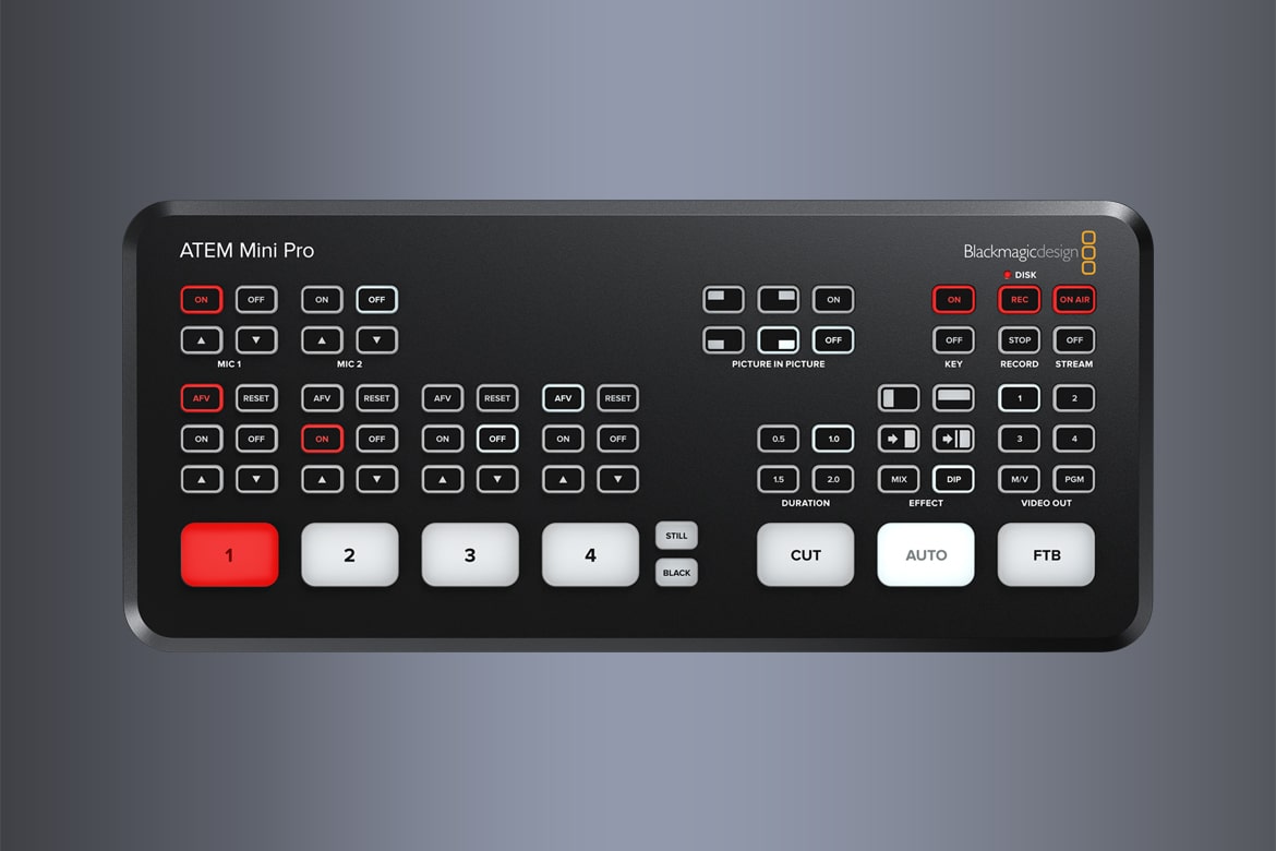 ATEM Mini Pro is fast to set up and easy to use. It includes 4 standards converted HDMI inputs, USB webcam out, HDMI out, Fairlight audio mixer with EQ and dynamics, DVE for picture in picture, transition effects, green screen chroma key, 20 stills media pool for titles and free ATEM Software Control. ATEM Mini Pro also includes direct recording to USB flash disks in H.264 and direct streaming via Ethernet to YouTube Live and more. There's also a multiview with 4 cameras, media, preview and program plus status of recording, streaming and audio.