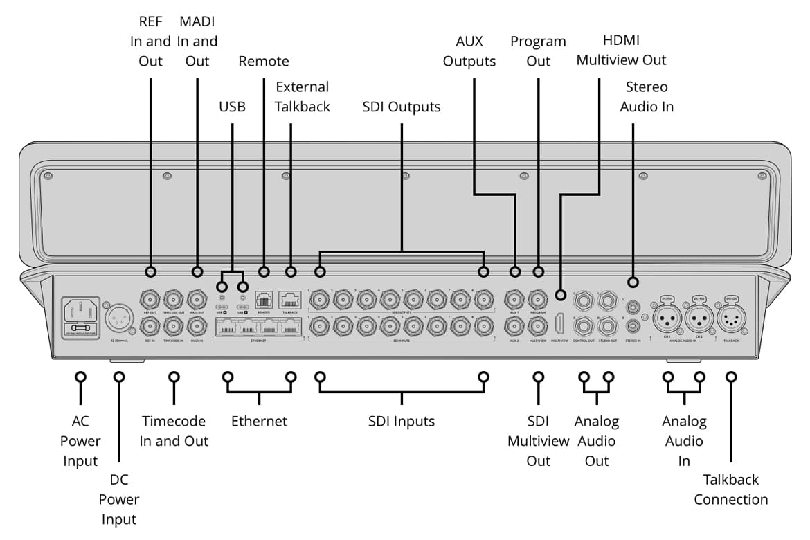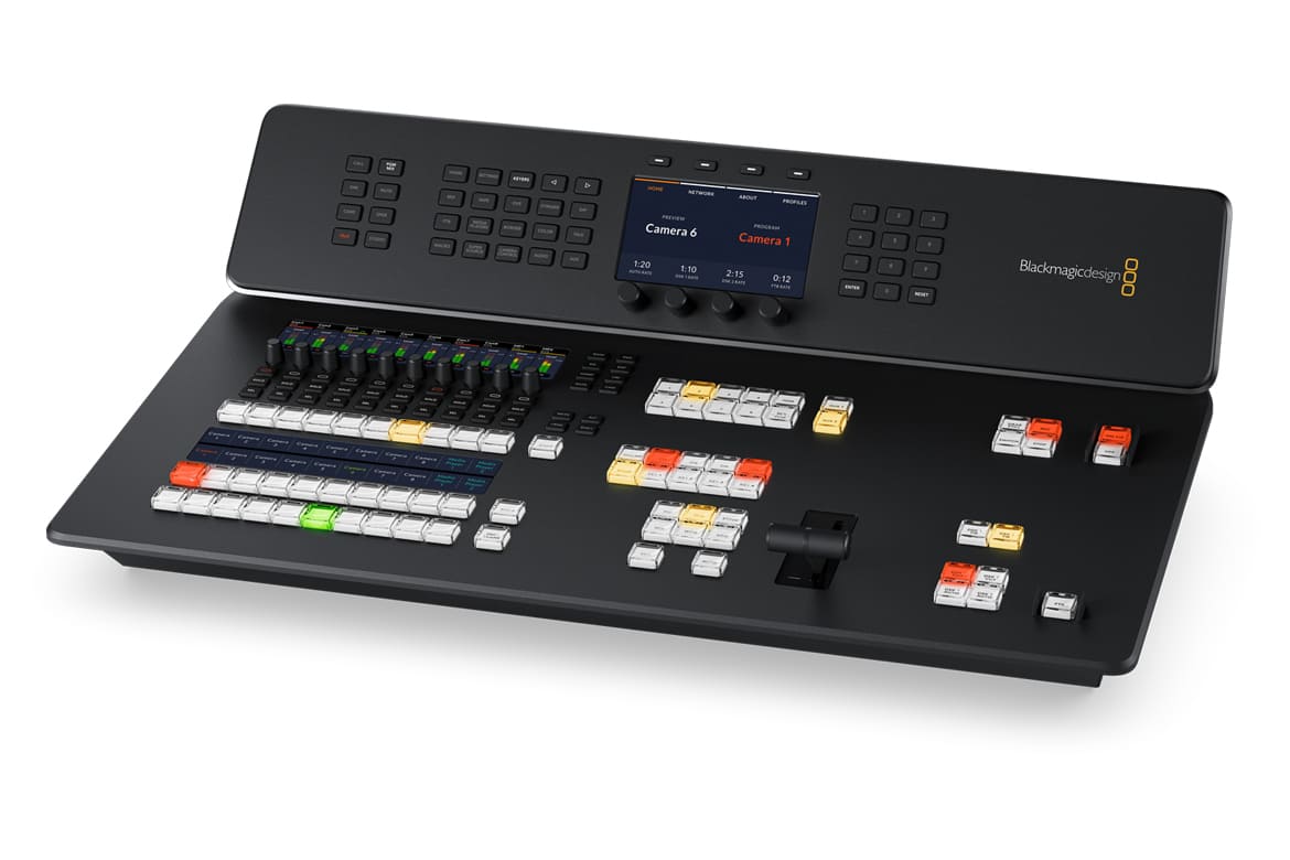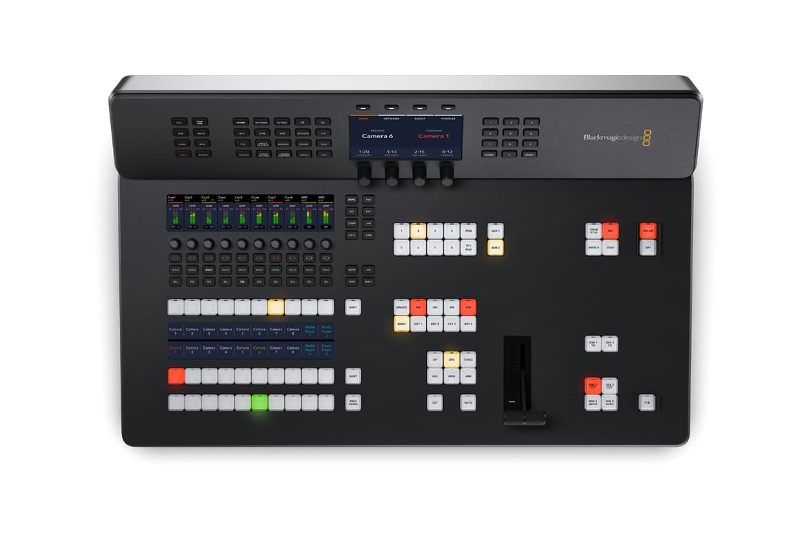 Compact live production switcher with built in broadcast control panel, 8 x 3G-SDI inputs, streaming, recording, multiview, DVE, keyers, USB webcam, media players, talkback and optional cloud storage!