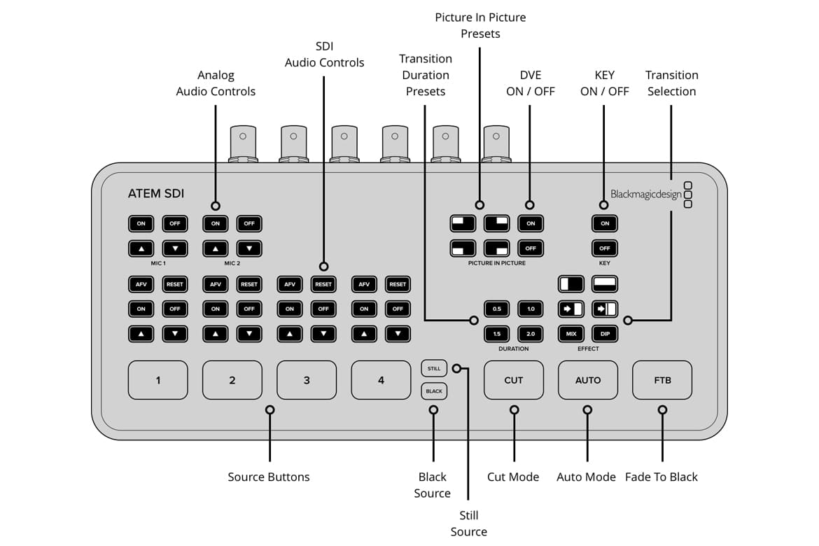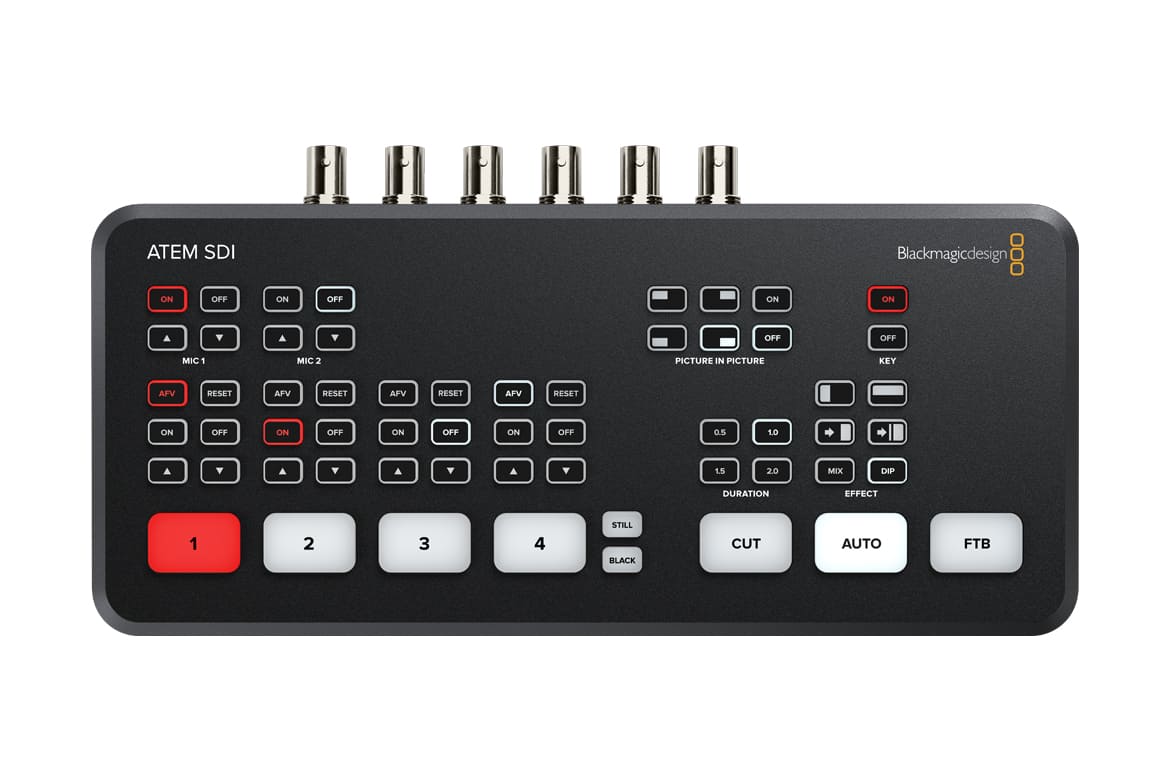 ATEM SDI is fast to set up and easy to use. It includes 4 standards converted SDI inputs, USB webcam, 2 SDI outputs, Fairlight audio mixer with EQ and dynamics, DVE for picture in picture, transition effects, green screen chroma key, 20 stills media pool for titles and free ATEM Software Control.
