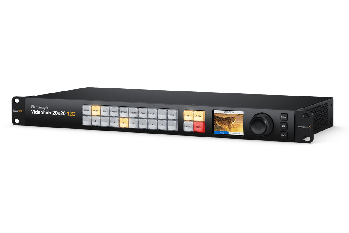 Blackmagic Videohub 20x20 12G is an advanced zero latency video router that supports any combination of SD, HD and Ultra HD on the router at the same time. It has 20 12G-SDI inputs and 20 12G-SDI outputs plus reference connections in a one rack unit size. The front panel LCD lets you see video before routing and clearly displays routing labels and video standards. Routing can be performed by direct button selection and using the large spin knob control that has an electronic clutch. It also features SDI re-clocking, external Ethernet control and supports all SDI video standards up to 2160p60.