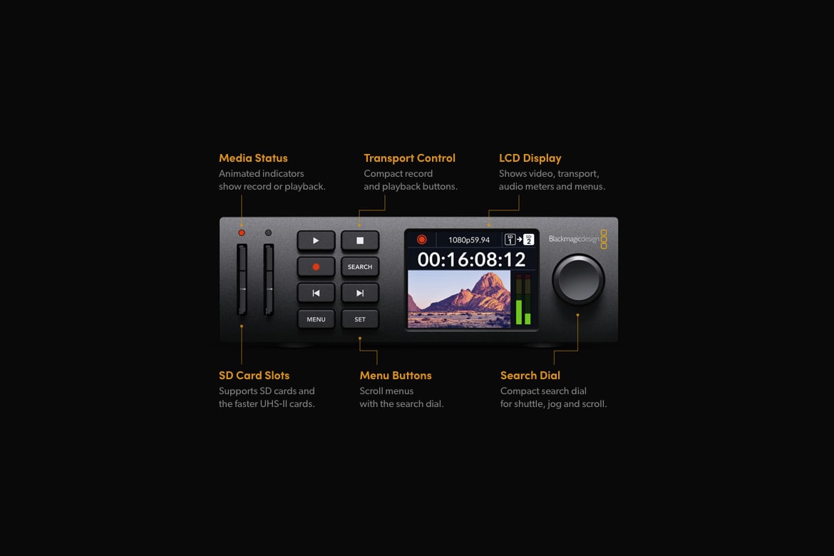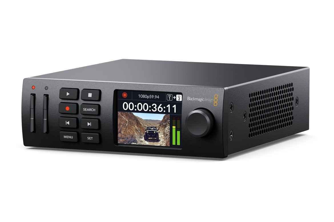 Miniaturized deck records H.264, ProRes or DNxHD files onto SD/UHS-II cards or external USB disks in SD/HD formats to 1080p60. Includes timecode and reference generators, 3G-SDI in/out and HDMI out.