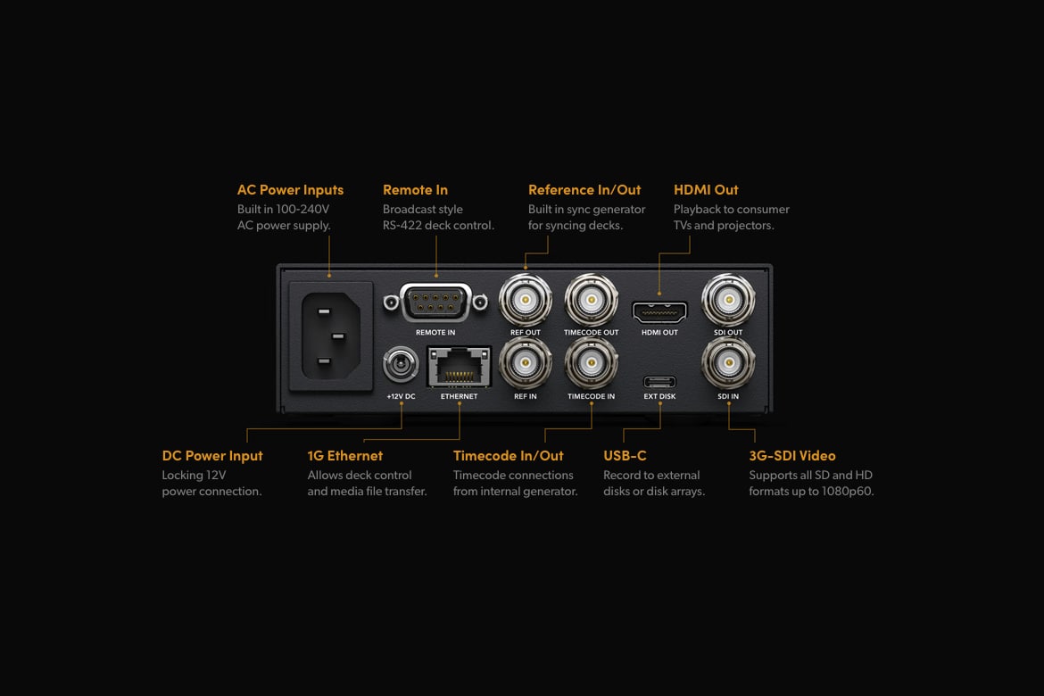 External Control | RS-422 deck control, SDI start/stop, timecode run. Includes Blackmagic HyperDeck Ethernet Protocol. Supports remote FTP file upload. |