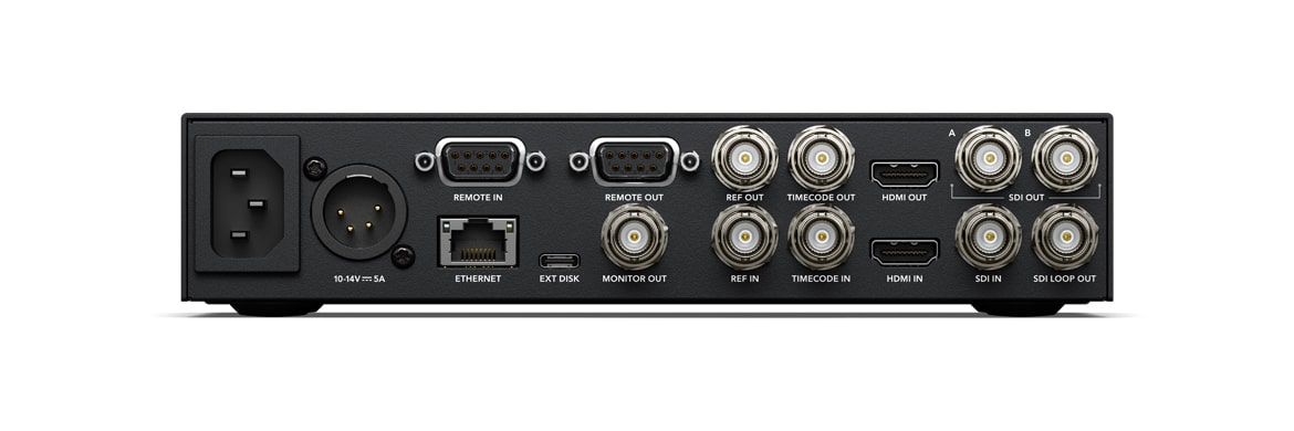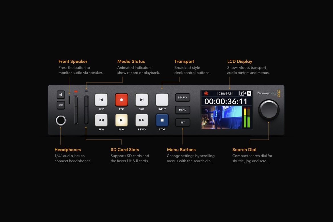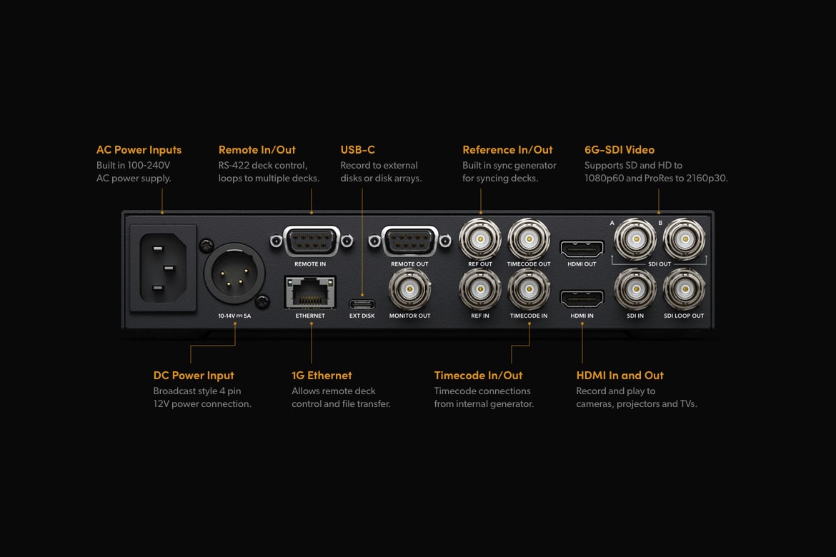 Includes features of the Mini model plus better transport controls, front panel headphone and speaker, 6G-SDI and fill and key out. Supports all codecs up to 1080p60 and ProRes and DNxHD to 2160p30.
