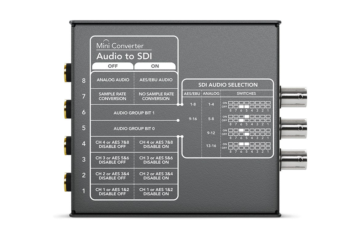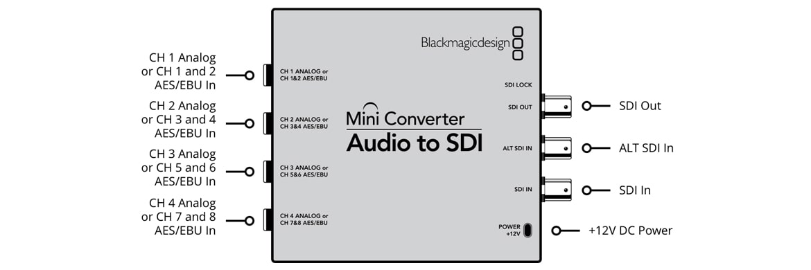 Embed audio into any SDI source in SD and HD formats up to 1080p60! Audio is input as balanced analog or AES/EBU using ¼ inch connectors from equipment such as mixers and analog decks. Mini Converter Audio to SDI is the ideal SD/HD SDI audio embedder for when you don’t need the cost of the Ultra HD model!