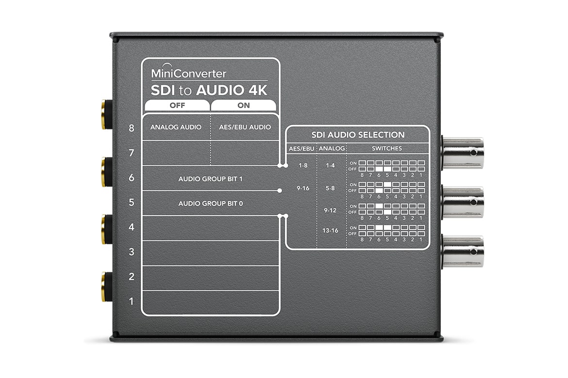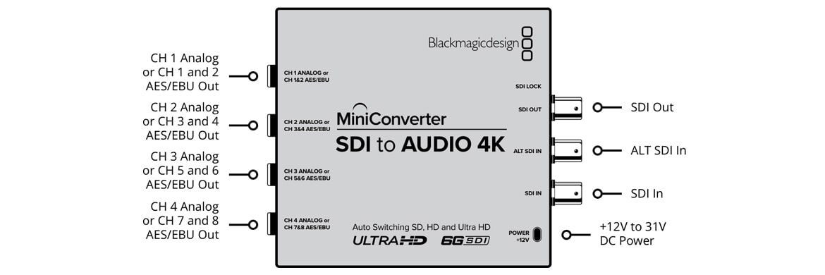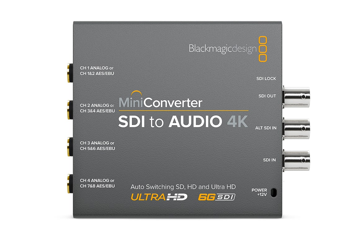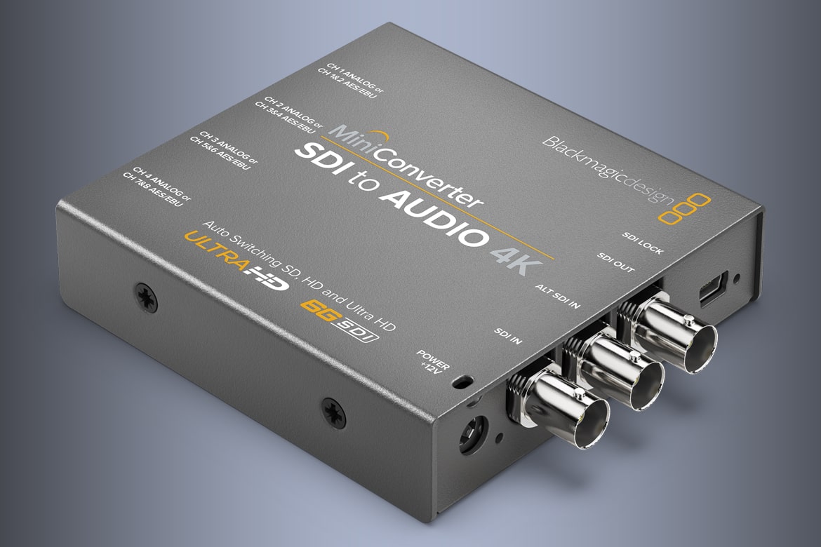 Mini Converter SDI to Audio 4K includes everything you need to de-embed 4 channels of analog audio or 8 channels of AES/EBU digital audio from any SDI video connection. Now you can access the audio in any SDI video connection for output to a massive range of audio equipment such as audio mixers, analog broadcast decks, audio monitors and more!