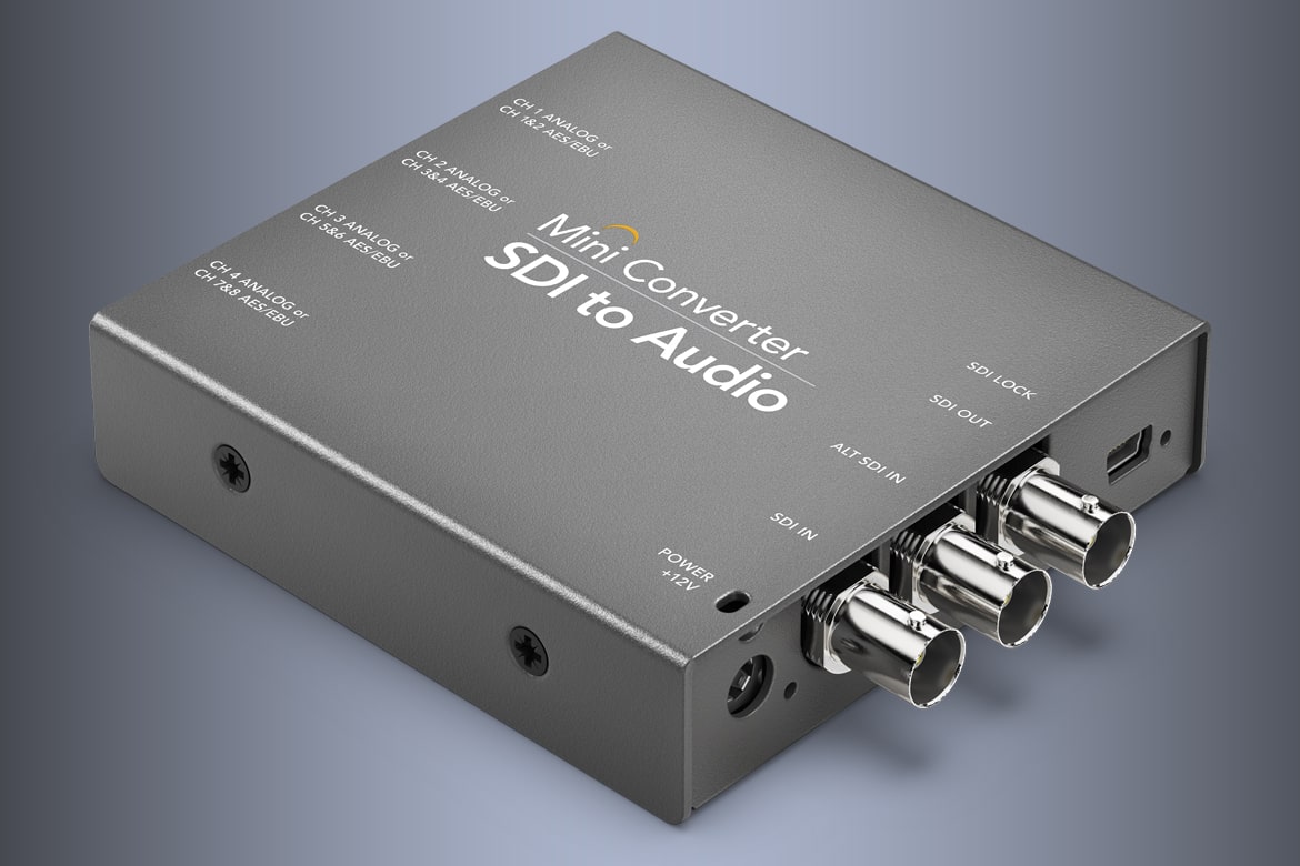 The perfect way to de-embed audio from any SDI source in SD and HD formats up to 1080p60! Audio is output on ¼" connectors for balanced analog and AES/EBU audio output to equipment such as mixers, analog decks, audio monitors and more. Mini Converter SDI to Audio is the ideal SD/HD SDI audio de‑embedder for when you don’t need the cost of the Ultra HD model!