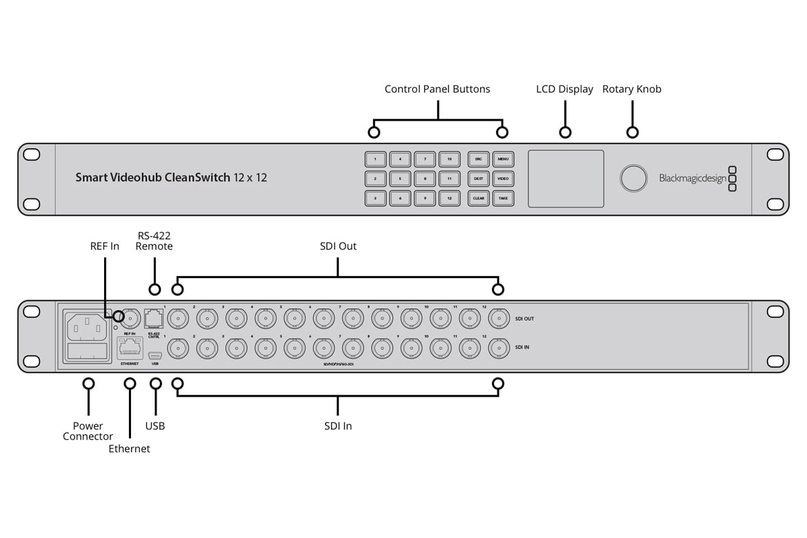 External Control Panel | Includes Blackmagic Videohub software control panel for Mac and Windows. Supports Blackmagic Smart Control and Blackmagic Master Control hardware panels. Includes Blackmagic Videohub SDK and Ethernet Videohub Control Protocol. |