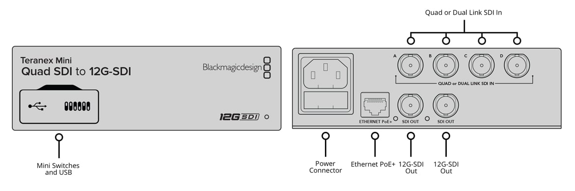 Convert Quad Link SDI to 12G-SDI so you can connect Quad Link Ultra HD equipment to the latest 12G-SDI Ultra HD equipment. Allows equipment that uses four BNC cables to be connected using a single 12G-SDI BNC cable for connecting to the latest routers, switchers, projectors and more! Supports both Level A and Level B 3G-SDI equipment.
