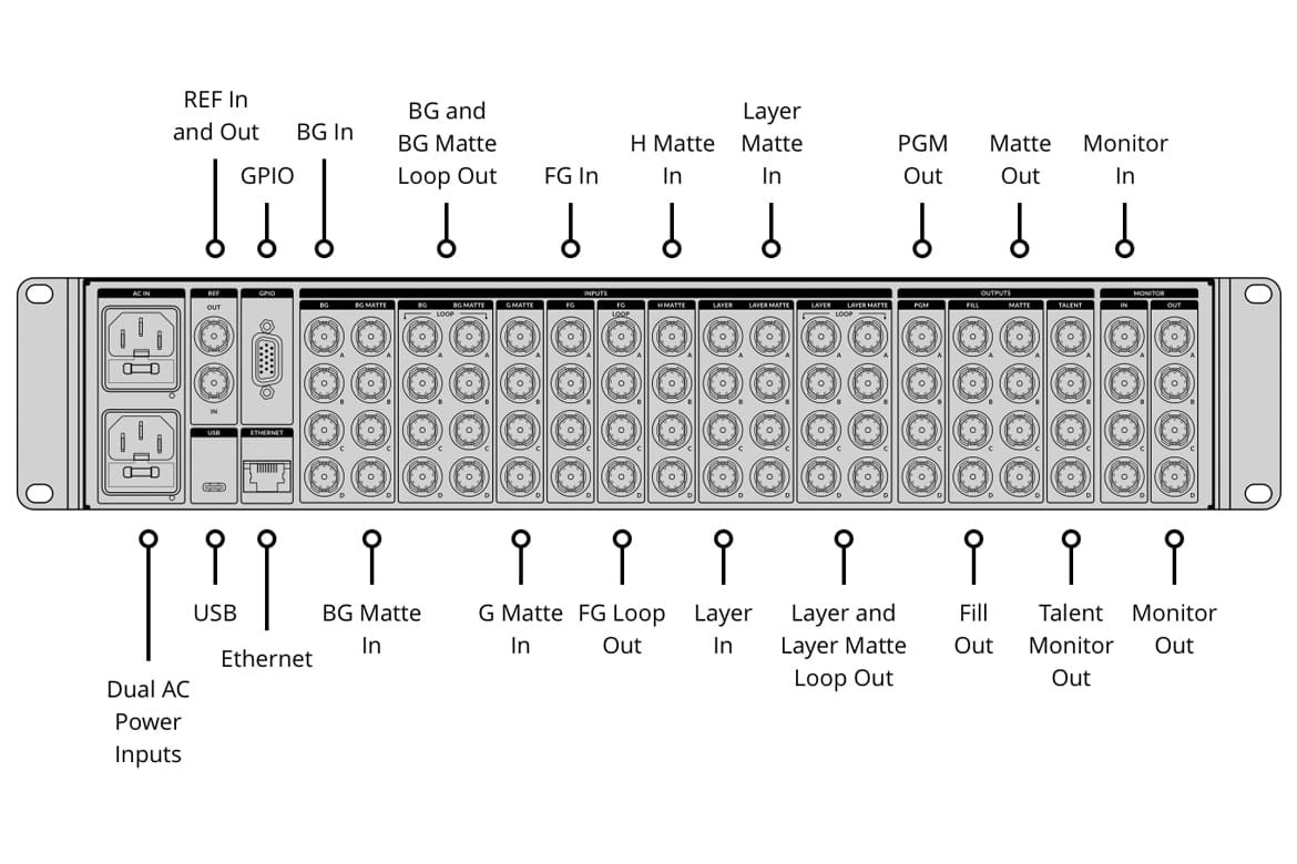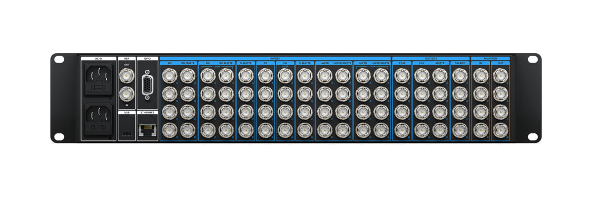 Monitor Out | 4 x 12G-SDI For monitoring Program, Foreground Input, Background Input, Combined Matte, Internal Matte, Fill Out, Layer Input, Background Matte Input, Garbage Matte Input, Holdout Matte Input, Layer Matte Input, Processed Layer Matte, Processed Holdout Matte, Processed Garbage Matte, Processed Background Matte, Screen Correction. |