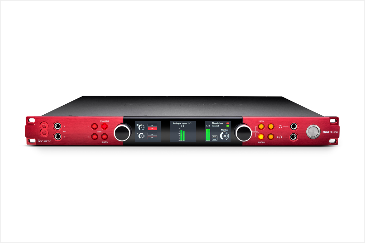 Other features of the Red 8Line include precision metering and display: the interface has three LCD displays for highly-accurate level metering for any input or output block, as well as main monitor and headphone outputs. Two discrete high-fidelity headphone outputs are powerful enough to deliver loud and clear audio on high-impedance headphones, and are controlled from the interface front panel. Dual instrument inputs on the front panel ensure you always have immediate access to quickly plug in a guitar, for example, even when racked.