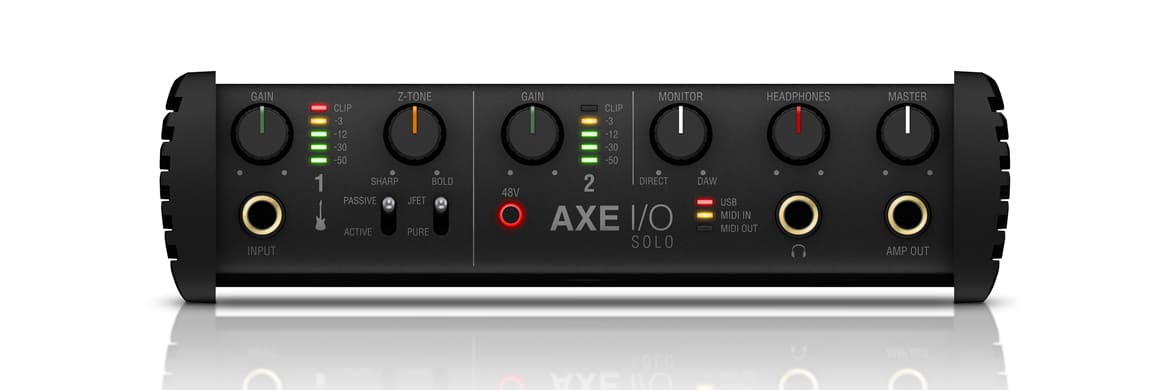 AXE I/O Solo also offers IK’s patent pending Z-TONE® circuit, letting you dial in impedance from 1 MOhm (“sharp”) down to 2.2 kOhms (“bold”) that interacts with your pick-ups.