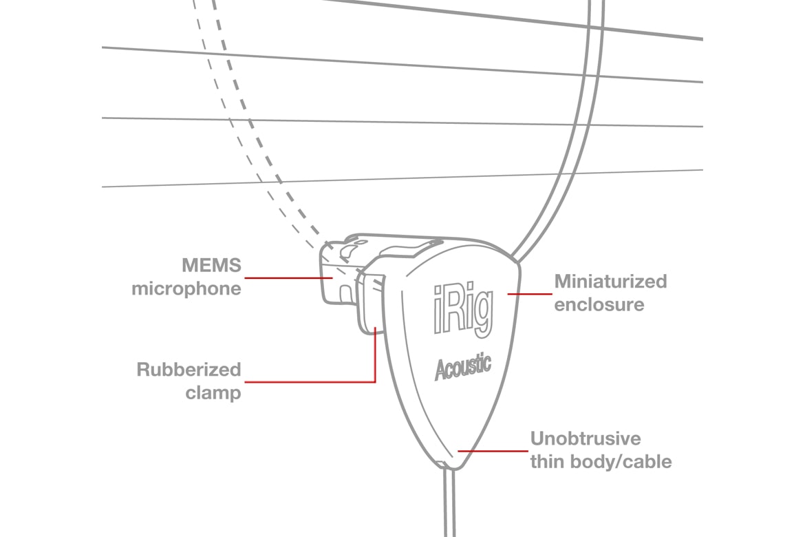 There’s no argument that the best acoustic guitar sound reproduction comes from placing a high-end condenser studio microphone in just the right position in front of the guitar. iRig Acoustic, when used with AmpliTube Acoustic, is designed to perfectly replicate that ideal mic placement and accurately capture the full frequency range, tonal character and complex harmonics and overtones of acoustic guitars. It's able to do this thanks to the combination of its uniquely designed microphone enclosure, which combines the latest MEMS (MicroElectrical-Mechanical System) microphone technology with an omnidirectional polar pattern, placement of the microphone just inside the sound hole where the output is optimal and the sound is very detailed and focused, and the “calibration” process that optimizes the guitar sound like it is being miked externally with a high quality studio microphone. These technologies combine to capture the "complete picture" of an acoustic guitar — every vibration and sonic interaction — unlike piezo-electric pickups or magnetics that just capture the vibrations of the body top or strings. Simply put, iRig Acoustic delivers a pure and full representation of an acoustic guitar's tonal characteristics.More on MEMS