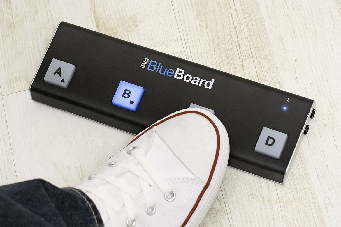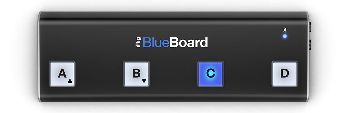 The iRig BlueBoard Wireless MIDI Pedalboard from IK Multimedia operates on Bluetooth 4.0/Bluetooth Low Energy technology to wirelessly control your iOS and Mac music apps while performing or recording. It has four LED backlit control pads that can be used to switch between presets, change patches, and turn effects on and off in any Core MIDI compatible app such as IK Multimedia's AmpliTube, VocaLive, SampleTank, the iGrand Piano or Apple's GarageBand. The BlueBoard features two 1/4" TRS inputs for use with MIDI expression controllers to add wah or volume pedal effects to you performance. It is powered by four AAA batteries and has a range of operation up to 10 meters.