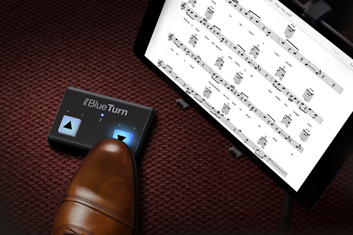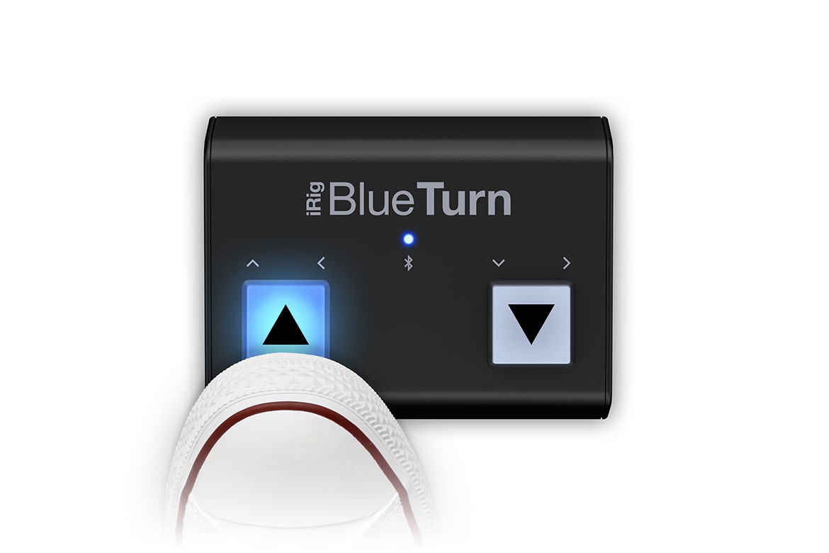 Designed to work across Bluetooth platforms with iOS and Android devices, IK-Multimedia's iRig BlueTurn is a pedal that allows you to scroll through digital sheet music with the tap of your foot. Now you no longer need to take your fingers off your flute to get to the next page; if you're utilizing a tablet for your music-reading needs, simply tap your foot on the back-lit up or down arrow located on the pedal to send an HID message to your tablet, thereby "flipping the page."