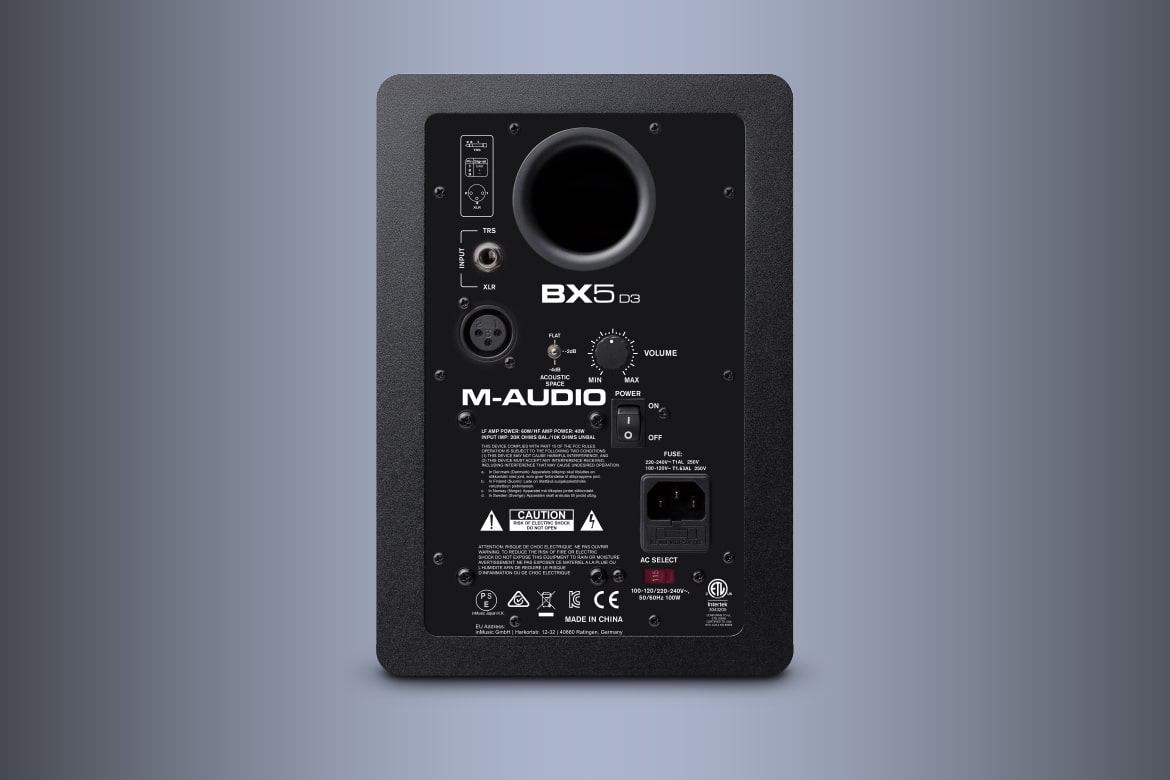 The BX5 D3 from M-Audio is a 2-way, 100W powered studio monitor designed to offer a wide frequency response and easy configuration for mixers, DJs, producers, and recordists in small control rooms, personal studios, and mobile rigs. The monitor produces a frequency response of 52 Hz to 35 kHz, thanks to two Class A/B amplifiers feeding a 5” Kevlar woofer and 1” silk dome tweeter.