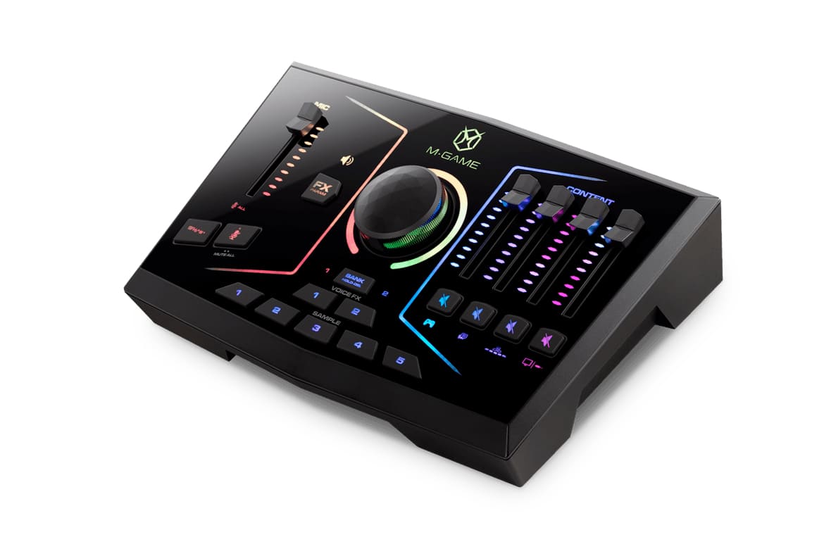 M-GAME RGB Dual is a USB streaming audio interface/mixer with LED lighting, sampler, and voice shaping and effects combined with a professional audio interface and physical mixing control surface. With M-GAME RGB Dual, you can easily create an entertaining and customizable livestreaming set-up with tools at your fingertips that will enhance your gaming experience and wow your audience.