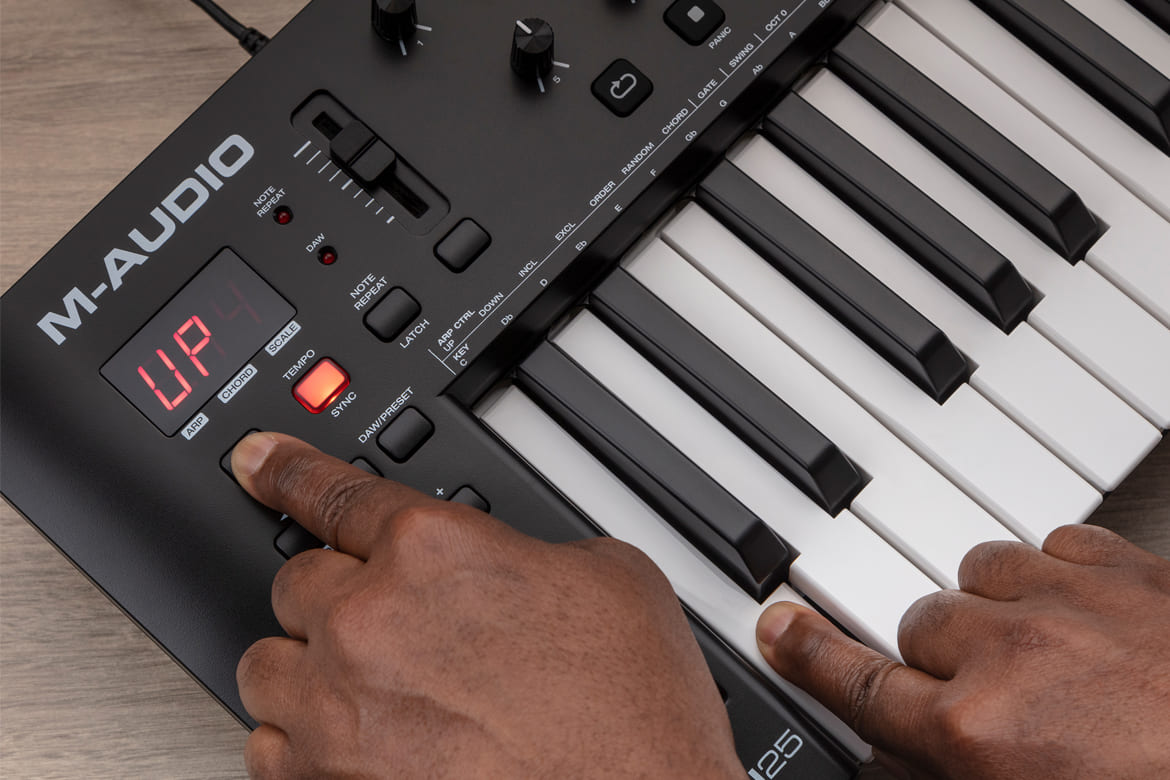 Arpeggiators help add excitement and movement to music quickly and easily. The built-in Arpeggiator on the Oxygen 25 (MKV) with Type, Octave, Gate and Swing controls will creatively affect anything you are playing on the keys from any virtual instrument in your DAW. When the Arpeggiator is activated, the keyboard will repeatedly play the keys that are pressed in the selected sequence. The arpeggiator’s timing and rhythm is based on the keyboard’s time division setting in either the keyboard’s tempo, or your DAW’s tempo setting. Each note in the arpeggio will be the length selected for the time division setting. For example, if you select 1/4, each note in the arpeggio will be audible in quarter note increments. This powerful tool can operate in Latch or Momentary mode, making it easy to unleash your creativity.