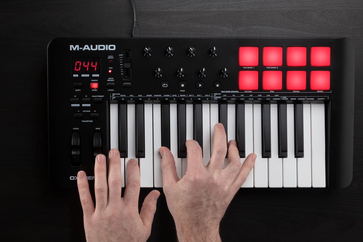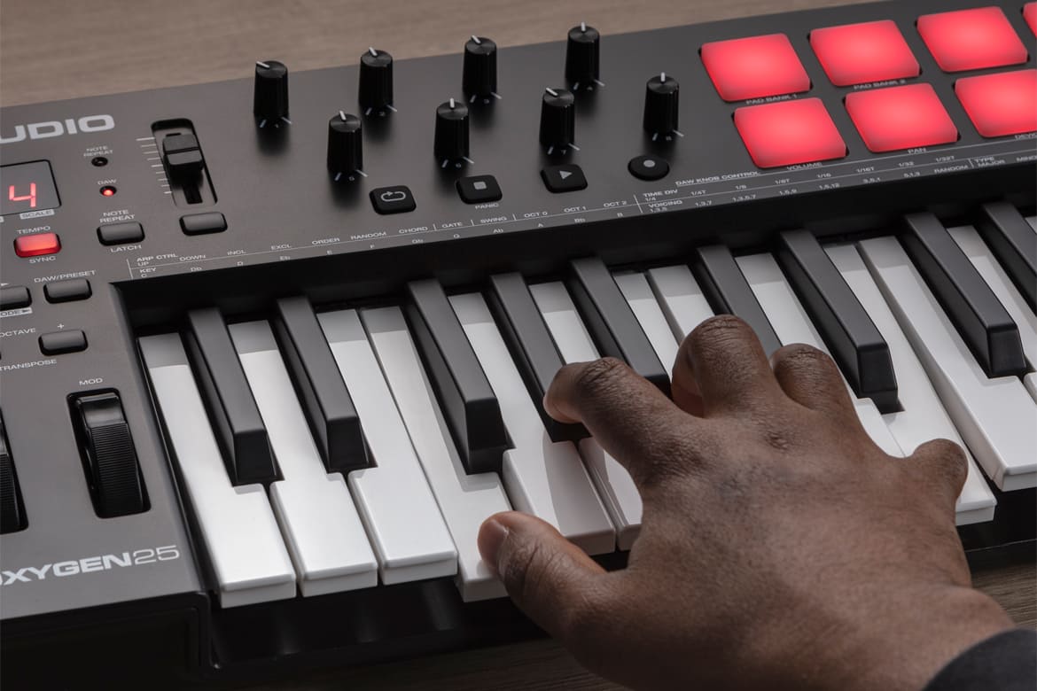 The Oxygen 25 (MKV) controller includes powerful features essential for creating and producing music such as Note Repeat (a staple mark in beat production), Full Velocity Control of keys and 8 pads, 8 assignable knobs for controlling effect plugins and virtual instruments, and an assignable fader for mixing: all opening a world of precise music creation techniques making your signature sound professional and modern.