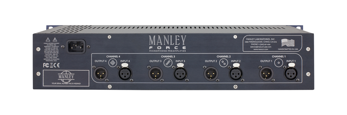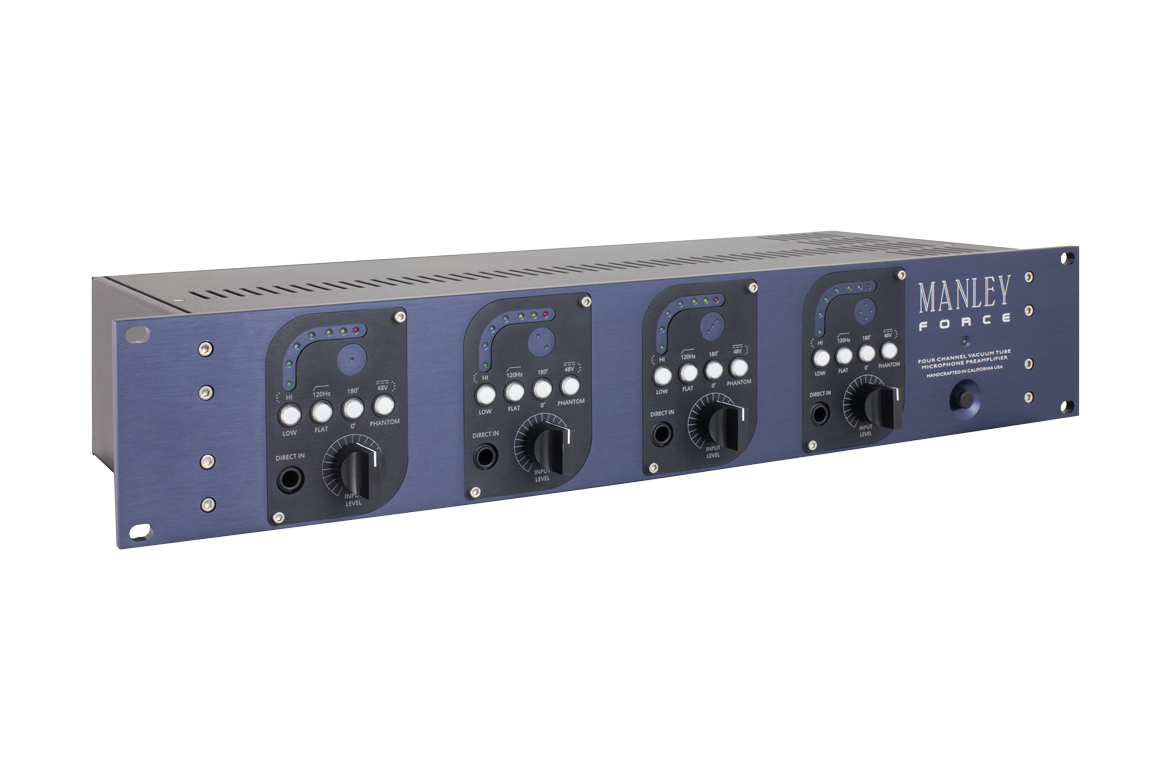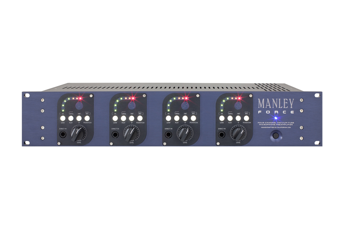 Taking the preamp section from their Core channel strip, the Force 4-Channel Vacuum Tube Microphone Preamplifier from Manley Labs provides you with 4 tube-driven microphone preamps in a single 2RU unit. Each of the 4 independent preamps gives you up to 95 dB of gain, along with independently selectable 48V phantom power, phase reverse, and a high-pass filter at 120 Hz. The selectable Hi/Low button acts as a 20 dB pad for louder sources.