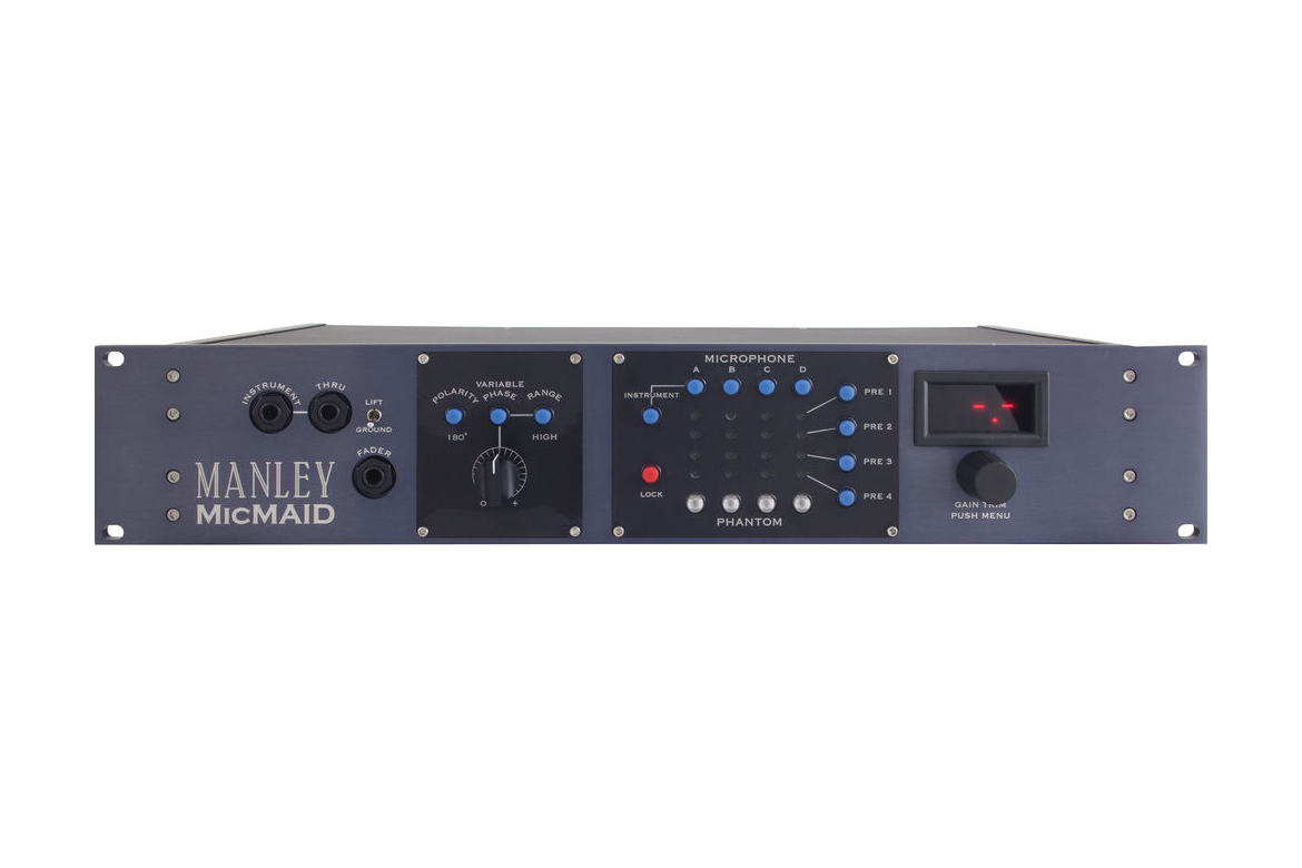 The MicMAID Matrix-Switcher from Manley Labs was designed for auditioning combinations of four microphones with four microphone preamps through a fast-acting matrix system. The unit features four inputs for both microphones and preamps, while dedicated returns and direct outputs are offered for each micpre. The front panel has four sections including instrument input, phase control, routing matrix, and monitor control.
