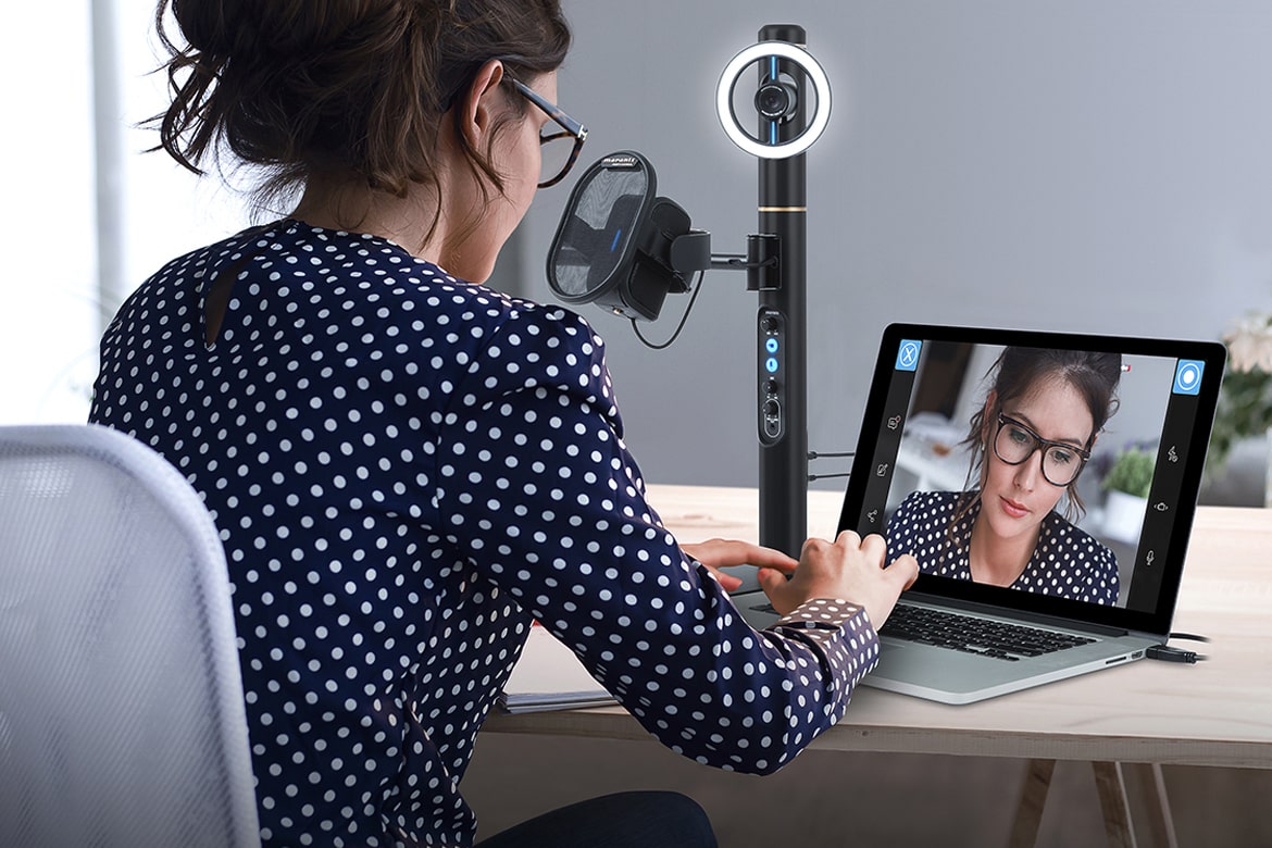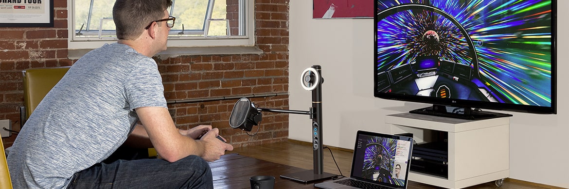 The LED ring light surrounds the Turret camera, providing even illumination of the streamer/podcaster. This dimmable, daylight-balanced LED fixture comes with cool white, and warm filters for matching to the light at your location.
