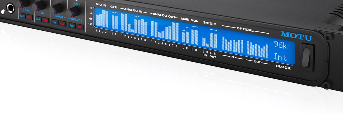 View all I/O activity at a glanceThe large backlit 324 x 24 LCD lets you view all signal activity at a glance with detailed metering for all analog and digital I/O. Access hardware settings from a simple and convenient menu.