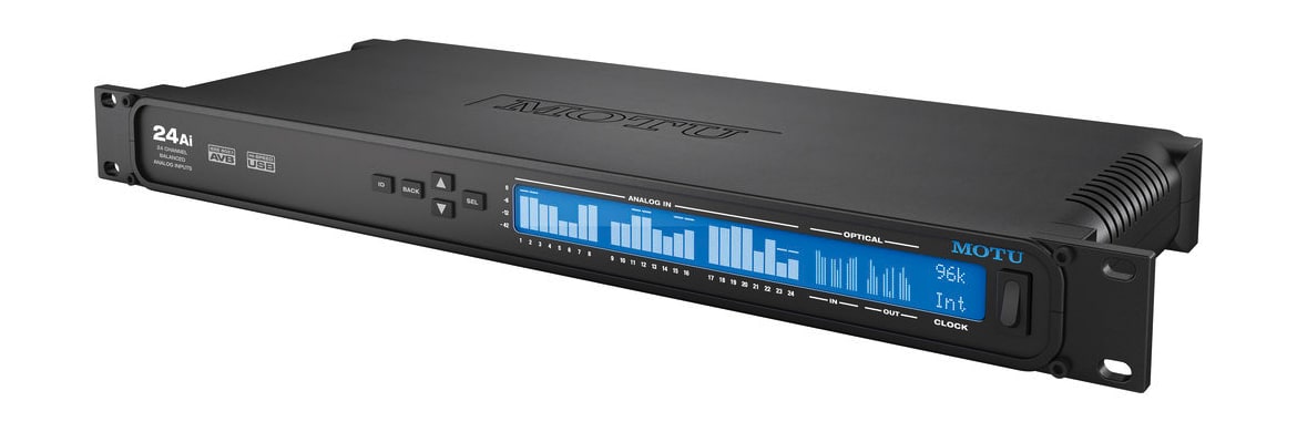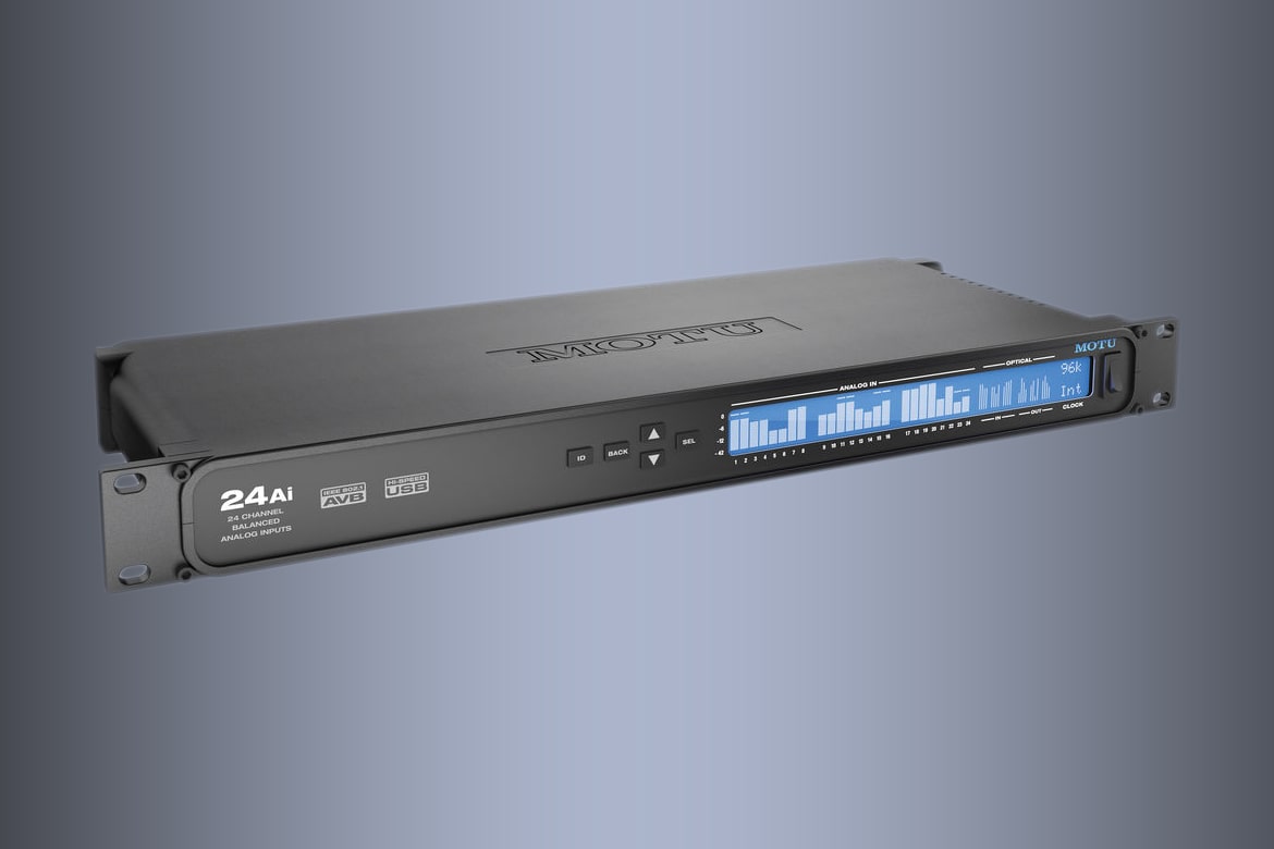 The 24Ai from MOTU is a single rack space USB 2.0 interface with industry-standard AVB networking for sub-millisecond network latency, and offers twenty-four channels of analog audio input combined with three banks of ADAT optical, for a total of seventy-two channels of I/O. The unit connects to a computer through USB 2.0, which provides more than enough bandwidth for the twenty-four analog channels, and when connected through AVB networking, supports hundreds of network channels.