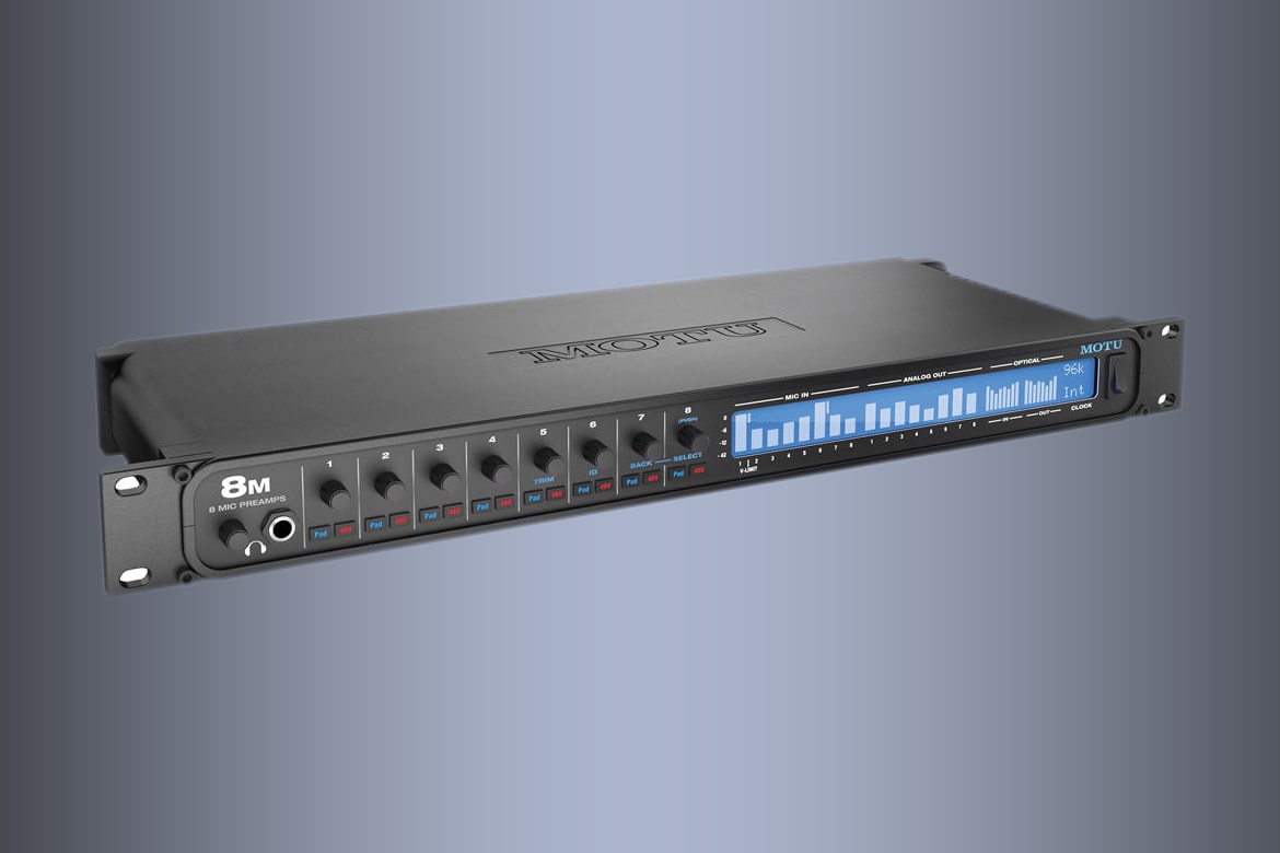 The MOTU 8M is designed for studio recording, installed sound, and live sound reinforcement applications such as mixing a band in a club or music venue. The 1U 19" rackmountable device features eight balanced combination microphone/line/instrument inputs with individually switchable +48V phantom power and pads, v-limiting circuitry to prevent clipping, 8 analog outs, one front panel stereo headphone output with gain control, 2 x 8-channel ADAT optical, and RCA S/PDIF (with sample rate conversion). Additional I/O can be added to the system through AVB networking.