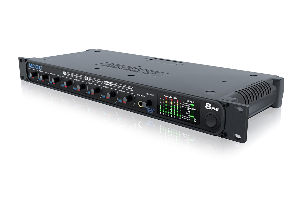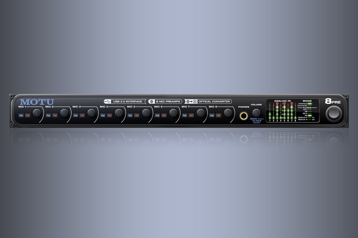 The 8pre audio interface delivers everything you need to turn your computer into a powerful 24-bit, 96kHz digital audio workstation. The 8pre provides eight microphone/instrument preamps with pristine 96kHz analog recording and playback, combined with 8 channels of ADAT optical digital I/O. Expand your system by connecting additional 8pres or other MOTU audio interfaces.