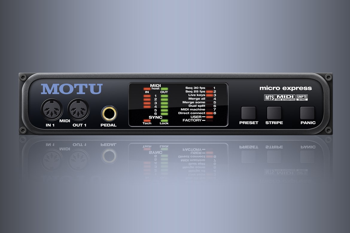 Built with MOTU’s award-winning MIDI interface technology, the micro express is a compact, bus-powered MIDI interface and time code synchronizer that provides expandable, plug-and-play connectivity to any USB-equipped Mac or Windows computer.