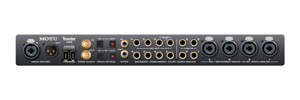 The Traveler-mk3 provides eight channels of pristine 192 kHz analog recording and playback, combined with twenty channels of digital I/O in ADAT optical, AES/EBU and S/PDIF formats. Expand your system by connecting additional MOTU FireWire audio interfaces or the 8pre mic input expander.