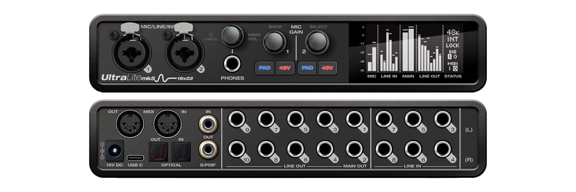 As an interface or mixer, the UltraLite-mk5 provides 18 inputs and 22 outputs, for a total of 40 simultaneous, independent I/O channels. You get 2 mic/line/instrument inputs, 6 line inputs, 10 line outputs, headphone out and 8-channel optical I/O. The optical ports alternatively support stereo TOSLink (optical S/PDIF).