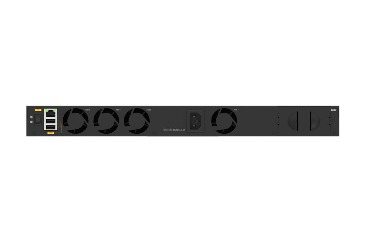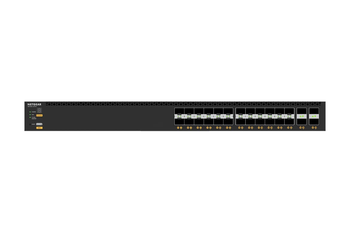 With Netgear's IGMP Plus, the M4350-24F4V switch delivers smooth video-over-IP multicasts with little to no setup required. Four 25G SFP28 ports are available for uplinks and stacking. Installing a separately purchased second power supply provides 1+1 redundancy. This switch works with Netgear's Engage Controller management platform, in addition to standard command line and web-based interfaces.