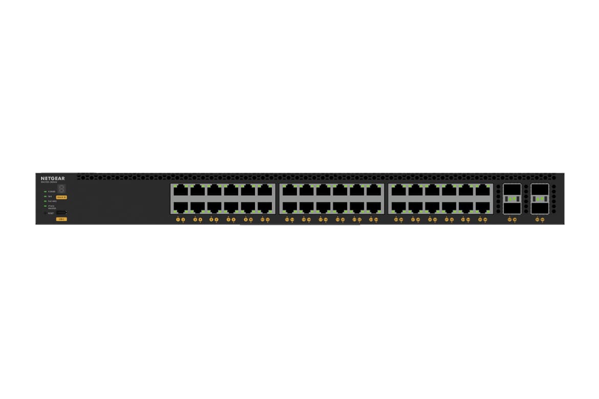 With Netgear's IGMP Plus, the M4350-36X4V switch delivers smooth video-over-IP multicasts with little to no setup required. Four 25G SFP28 ports are available for fiber uplinks and stacking. Installing a separately purchased second power supply provides 1+1 redundancy and can increase your PoE budget to up to 1760W. This switch works with Netgear's Engage Controller management platform, in addition to standard command line and web-based interfaces.
