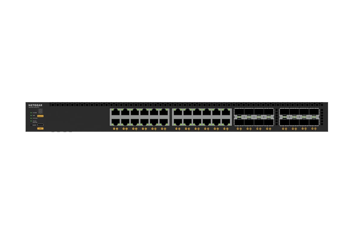 With Netgear's IGMP Plus, the M4350-24X8F8V switch delivers smooth video-over-IP multicasts with little to no setup required. Eight 10G SFP+ ports are available alongside eight 25G SFP28 ports for fiber uplinks and stacking. Installing a separately purchased second power supply provides 1+1 redundancy and can increase your PoE budget to up to 1770W. This switch works with Netgear's Engage Controller management platform, in addition to standard command line and web-based interfaces.