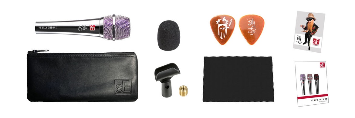 The sE Electronics V7 all-metal construction, stainless spring steel mesh grille, and gold-plated XLR contacts offer effective protection from the rigors of live performance. To stand out, the microphone features eye-catching, highly-polished chrome appointments. Included with the microphone area a carrying case, a mic clip, a thread, some Billy Gibbons guitar picks, and that aforementioned black windscreen.