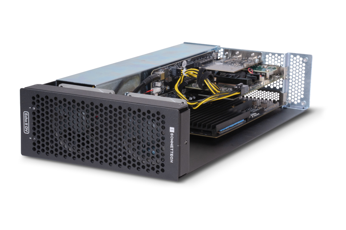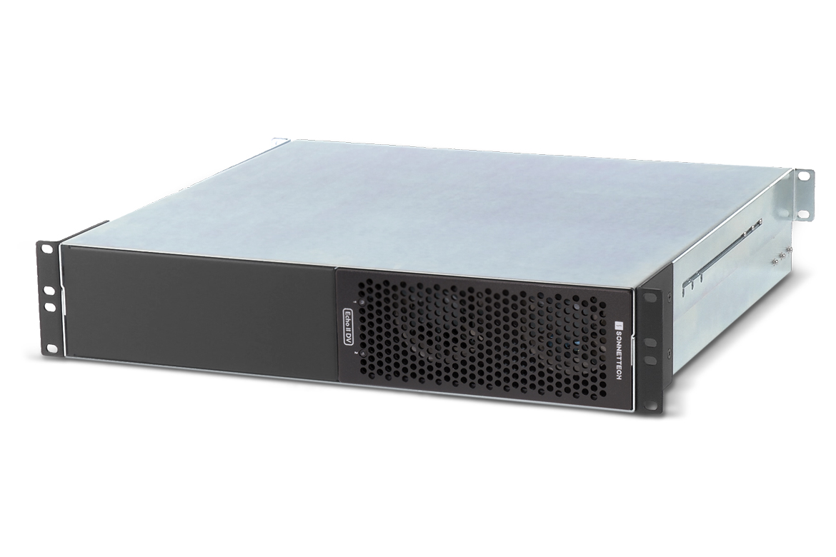 Sonnet has the ultimate solution for connecting cards with high bandwidth requirements — Echo™ II DV Rackmount — a professional Thunderbolt to PCIe card expansion system that enables you to connect two up to full-length (12.28 inches long), single-width PCIe cards to your computer, each to a separate Thunderbolt port (if needed) for maximum bandwidth to each card.