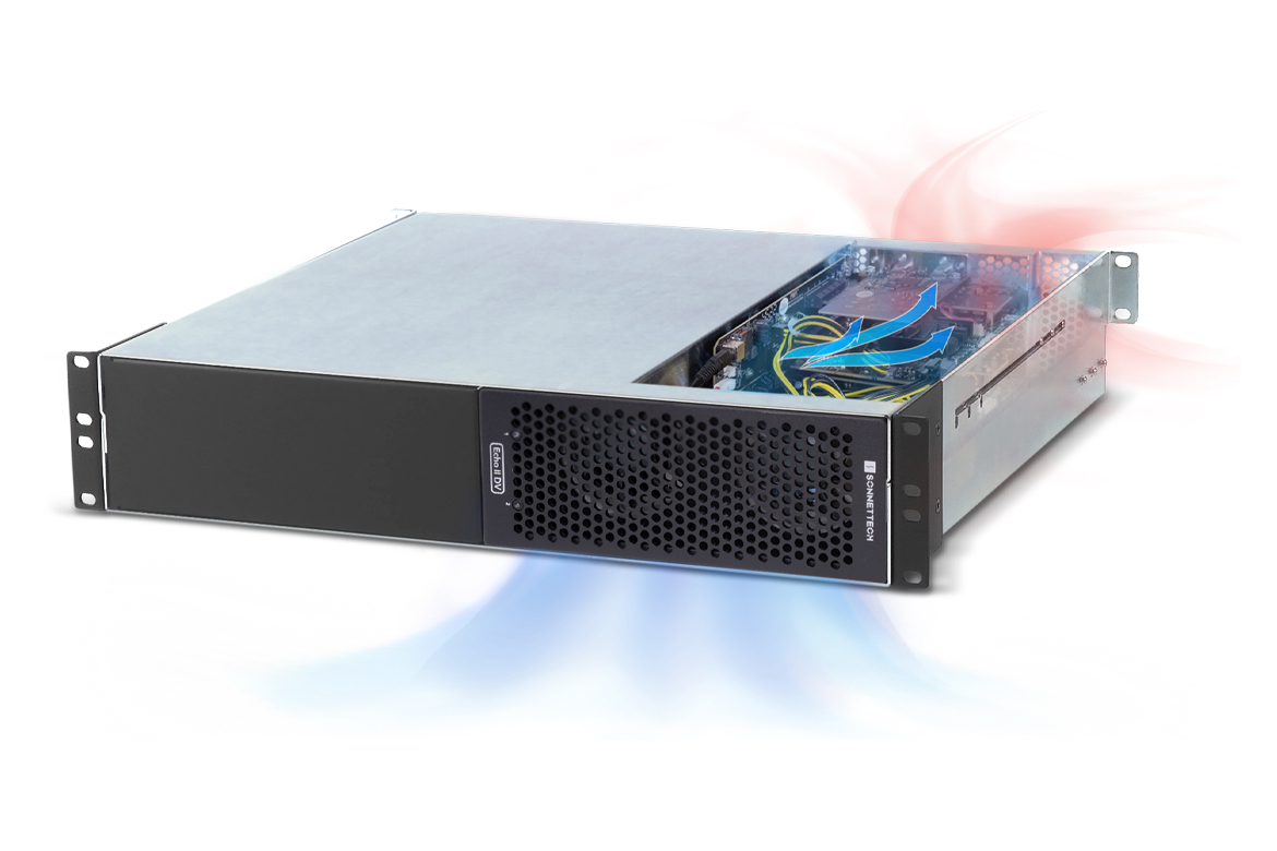 Two PCIe Card Slots. Dual Thunderbolt Interfaces for Double the Bandwidth.Some computers — such as the latest MacBook Pro®, Mac Studio®, Mac mini® and iMac® (plus some Windows PCs such as Dell XPS 9730)— have multiple Thunderbolt ports that are supported by separate 40Gbps Thunderbolt buses and provide up to 2880 MB/s of PCIe bandwidth to each port. Among multi-slot Thunderbolt to PCIe card expansion systems, the Sonnet Echo II DV Rackmount is unique. Instead of using one Thunderbolt interface for two or three slots — which dynamically allocates the PCIe bandwidth between them — Echo II DV employs one interface per slot. With each slot getting Thunderbolt’s full PCIe bandwidth, you can exploit two cards’ full potential when connected at the same time to separate Thunderbolt buses on the computer, ideal for cards with high bandwidth requirement such as DV I/O, NVMe SSD storage, and 10 and 25Gb Ethernet adapters.