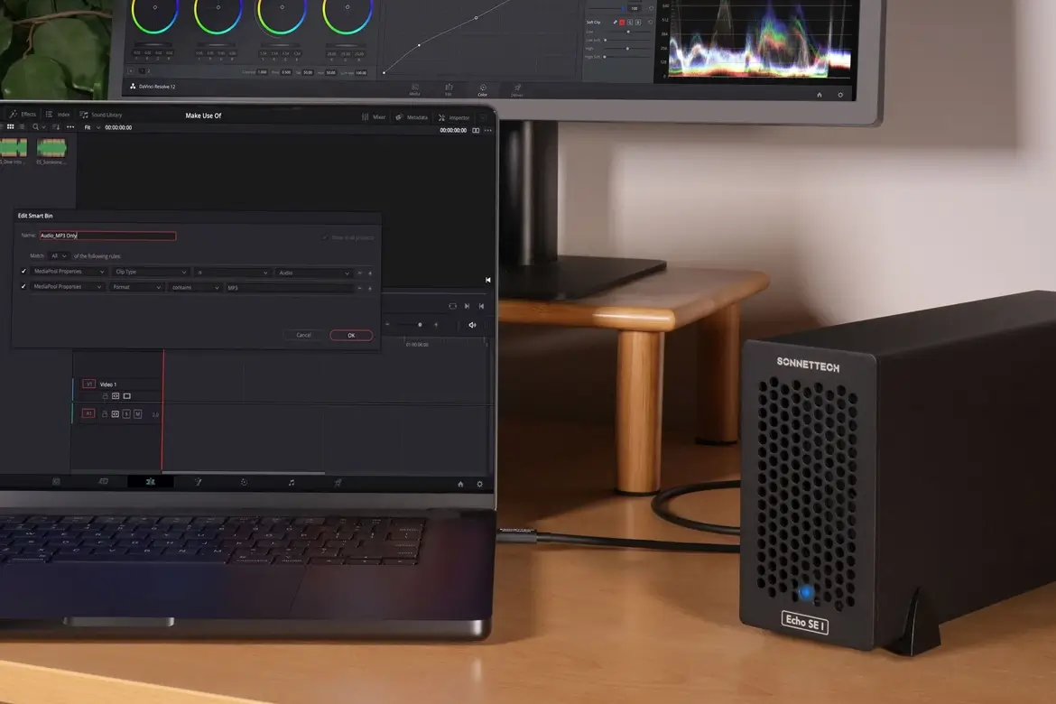 The Echo SE I T5 system’s lightweight, rugged aluminum outer shell securely houses the installed PCIe card. Because it automatically powers on and off with your computer, there is no power switch on the enclosure, ensuring you don’t waste energy by forgetting to turn it off.Nearly Noiseless Operation