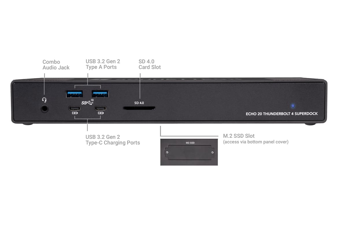 - Twenty Interfaces — SuperDock includes three Thunderbolt 4, four USB 3.2 Gen 2 Type A, and four USB 3.2 Gen 2 Type-C charging ports; HDMI port; RJ45 2.5 Gigabit Ethernet; 3.5mm combo audio; 3.5mm microphone; line-level R+L RCA audio out; SD 4.0 card slot; and M.2 SSD slot.