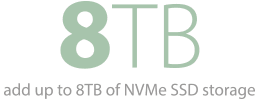 - M.2 NVMe SSD Slot — Add up to 8TB of storage inside (SSD sold separately); data transfer speeds up to 800MB/s for fast media storage and Time Machine backups.