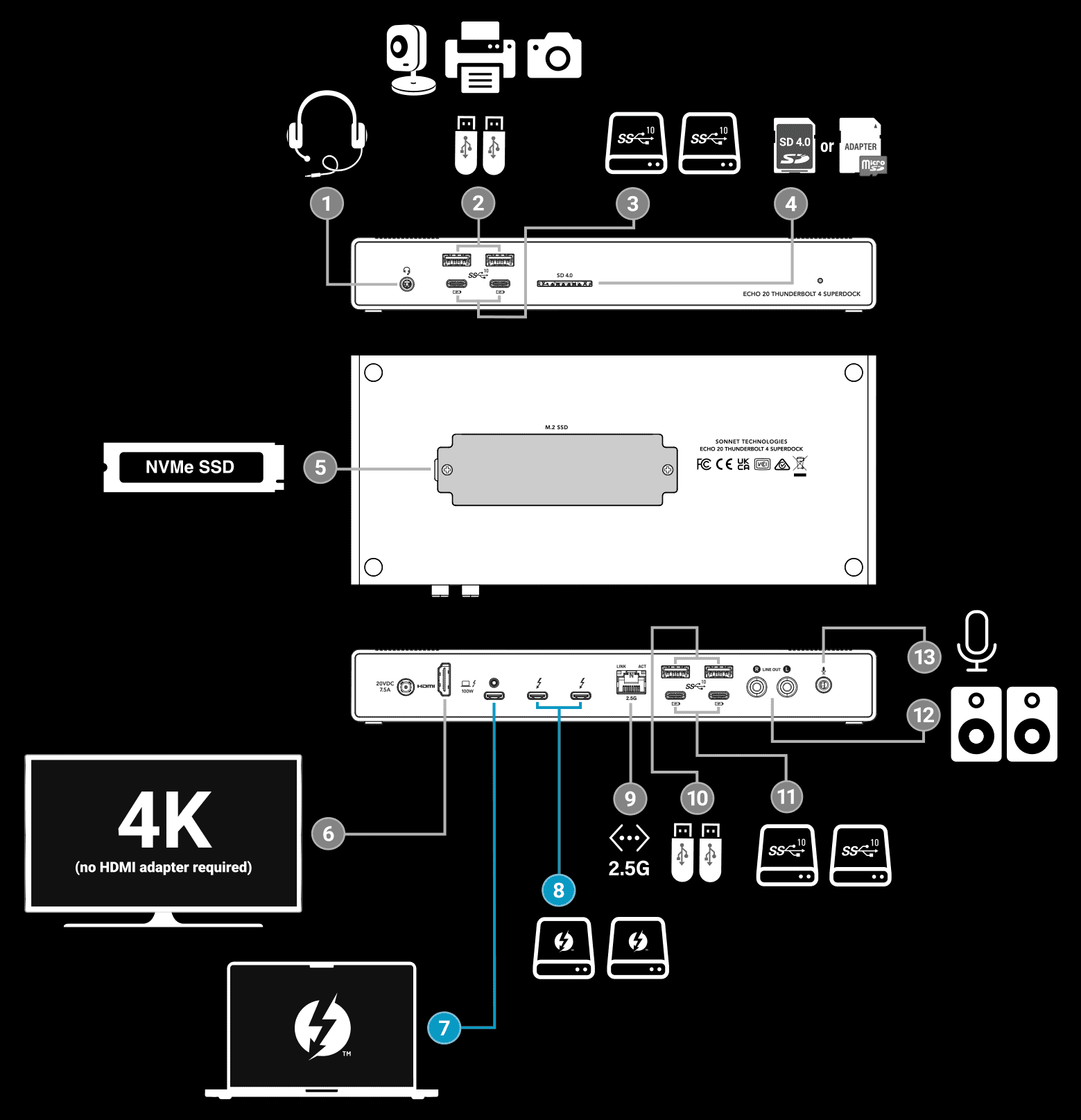 Expand Your Connectivity to the MaxMore connections than you expect from a Thunderbolt™ dock – NVMe SSD storage capability, an HDMI port, ultra-fast 2.5 Gigabit Ethernet support, and more! With this superdock, a single cable connects your computer to your digital world. The Sonnet Echo™ 20 Thunderbolt 4 SuperDock is your universal docking station for today and tomorrow.
