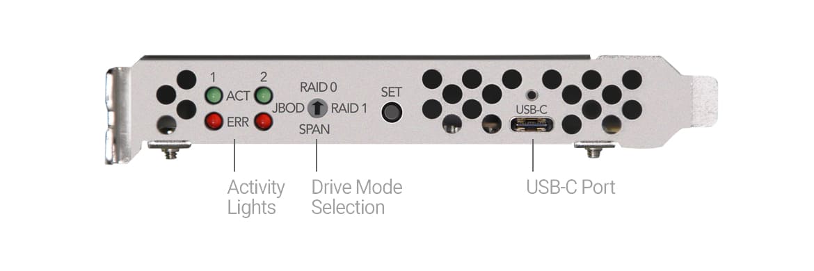 Dual 2.5-inch SSD PCIe 3.0 card with hardware RAID controller, plus 10Gbps USB-C port • Add your own SSDs