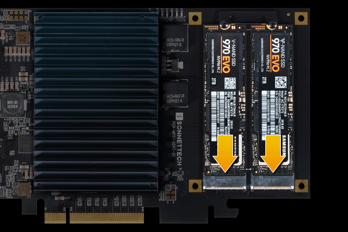 Install the McFiver PCIe Card into an available x8 PCIe 3.0 or 4.0 slot to obtain maximum performance in your computer. No PCIe card slots in your computer, but Thunderbolt ports outside? The McFiver provides great performance, a lot of connectivity, and is ideal for use in an Echo™ Thunderbolt™ to PCIe card expansion system with an available full-height x8 card slot. The combo enables you to take advantage or all that the McFiver has to offer with any compatible Mac (M1, M1 Pro, M1 Max, M1 Ultra, Intel®), Windows, or Linux computer with Thunderbolt ports.Dual M.2 NVMe SSD Slots